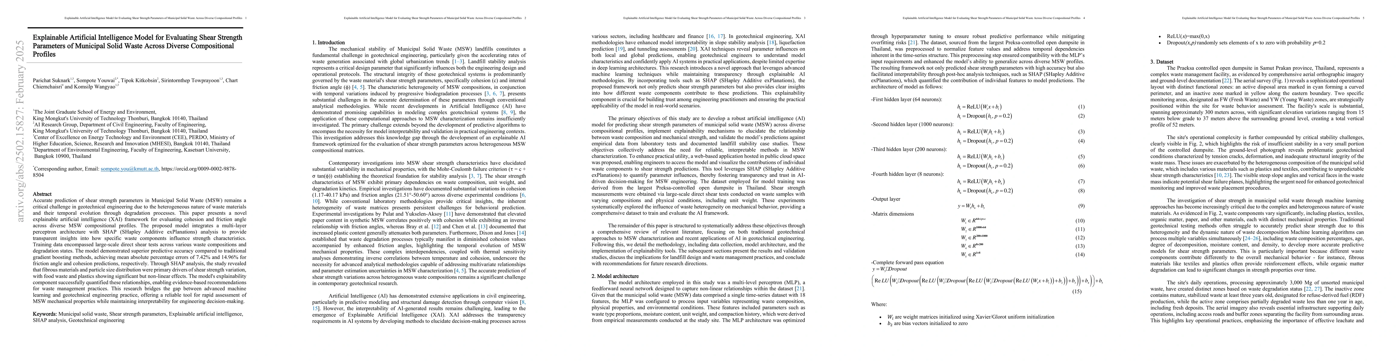The research presents a novel explainable artificial intelligence (XAI) framework integrating a multi-layer perceptron architecture with SHAP analysis for predicting cohesion and friction angle in Municipal Solid Waste (MSW) across diverse compositional profiles, trained on large-scale direct shear tests.