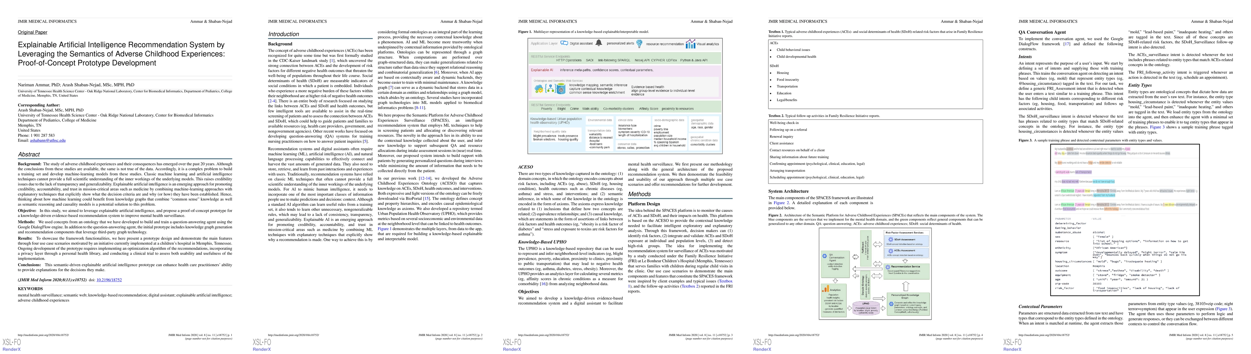 The study of adverse childhood experiences and their consequences has emerged over the past 20 years. In this study, we aimed to leverage explainable artificial intelligence, and propose a proof-of-concept prototype for a knowledge-driven evidence-based recommendation system to improve surveillance of adverse childhood experiences. We used concepts from an ontology that we have developed to build and train a question-answering agent using the Google DialogFlow engine. In addition to the question-answering agent, the initial prototype includes knowledge graph generation and recommendation components that leverage third-party graph technology. To showcase the framework functionalities, we here present a prototype design and demonstrate the main features through four use case scenarios motivated by an initiative currently implemented at a children hospital in Memphis, Tennessee. Ongoing development of the prototype requires implementing an optimization algorithm of the recommendations, incorporating a privacy layer through a personal health library, and conducting a clinical trial to assess both usability and usefulness of the implementation. This semantic-driven explainable artificial intelligence prototype can enhance health care practitioners ability to provide explanations for the decisions they make.