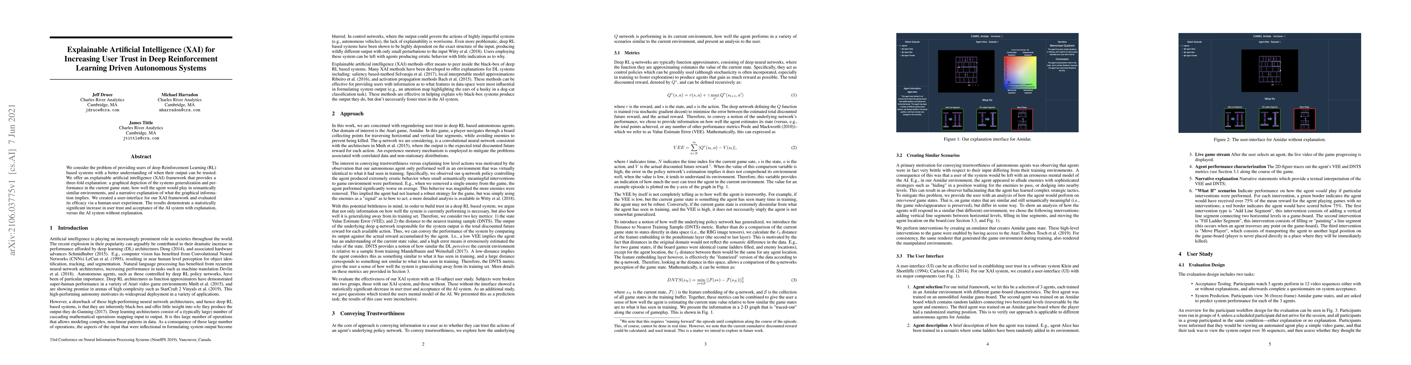 This paper proposes an XAI framework for enhancing user trust in deep reinforcement learning systems by providing graphical, comparative, and narrative explanations. A user-interface was developed and tested, showing a significant increase in user trust when explanations are provided.