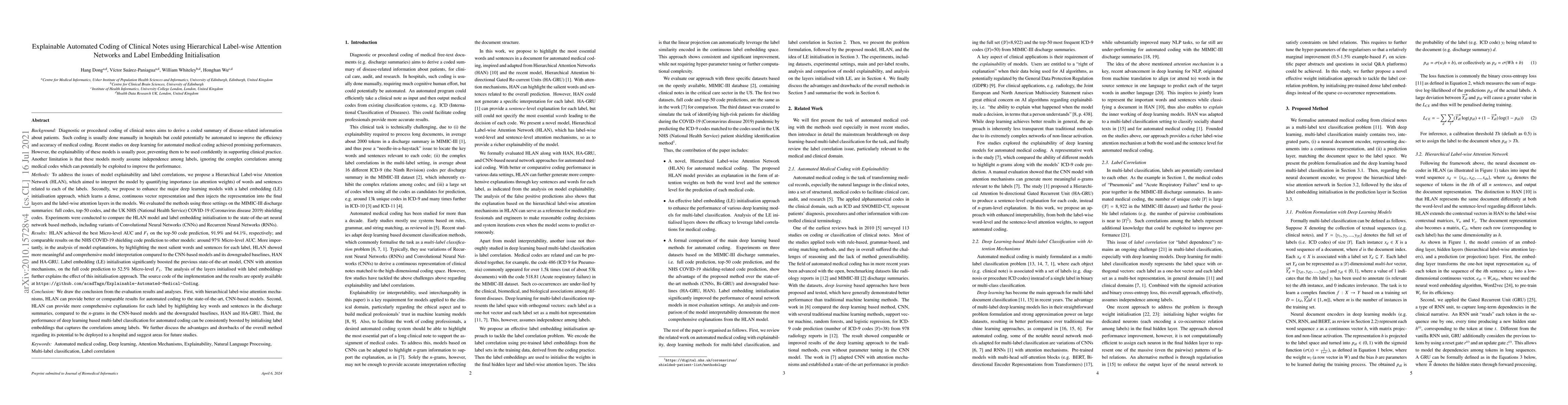 This paper proposes a Hierarchical Label-wise Attention Network (HLAN) to improve the explainability of automated clinical coding models and introduces Label Embedding (LE) initialisation to enhance model performance. HLAN interprets the model by quantifying the importance of words and sentences related to each label, while LE initialisation improves deep learning models by embedding label representations. The proposed methods were evaluated on MIMIC-III discharge summaries, showing improved interpretability and performance compared to state-of-the-art neural network methods.