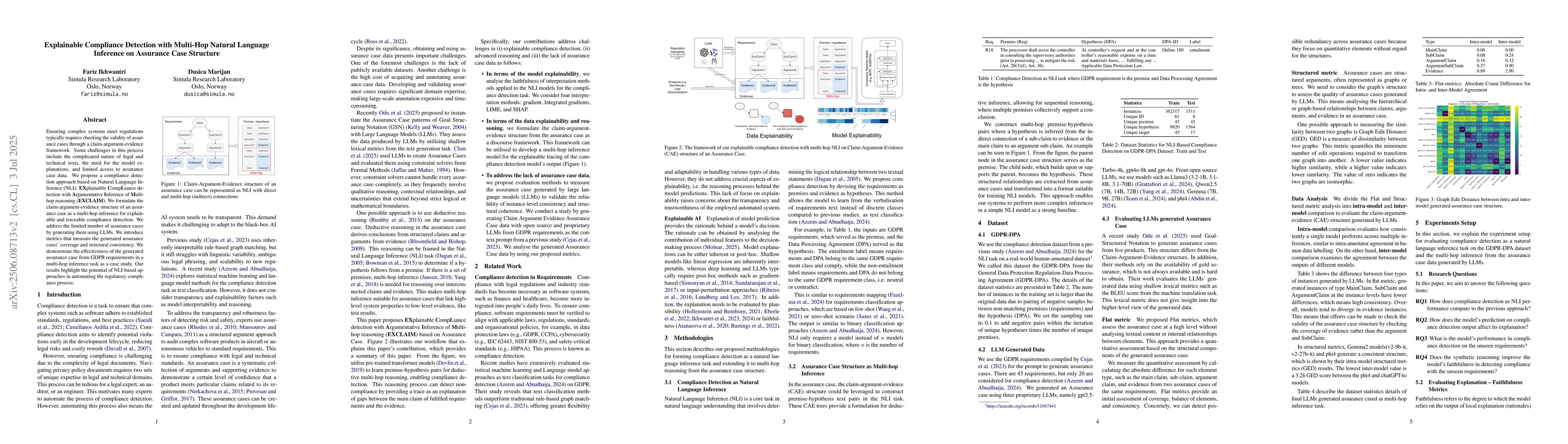 Ensuring complex systems meet regulations typically requires checking the validity of assurance cases through a claim-argument-evidence framework. Some challenges in this process include the complicated nature of legal and technical texts, the need for model explanations, and limited access to assurance case data. We propose a compliance detection approach based on Natural Language Inference (NLI): EXplainable CompLiance detection with Argumentative Inference of Multi-hop reasoning (EXCLAIM). We formulate the claim-argument-evidence structure of an assurance case as a multi-hop inference for explainable and traceable compliance detection. We address the limited number of assurance cases by generating them using large language models (LLMs). We introduce metrics that measure the coverage and structural consistency. We demonstrate the effectiveness of the generated assurance case from GDPR requirements in a multi-hop inference task as a case study. Our results highlight the potential of NLI-based approaches in automating the regulatory compliance process.