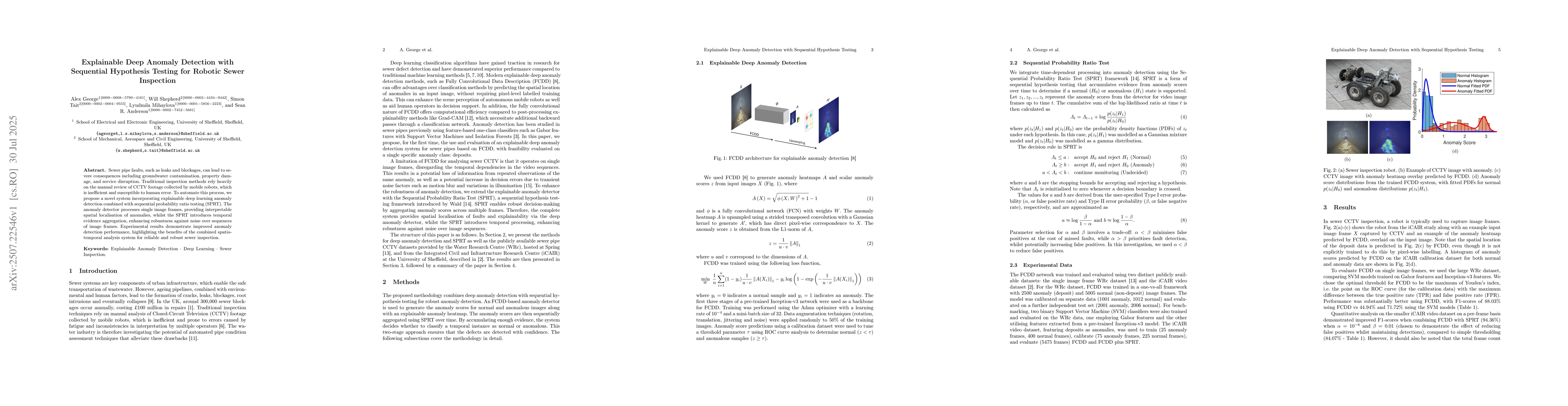 The research proposes a novel system for automated sewer inspection combining explainable deep learning anomaly detection with sequential probability ratio testing (SPRT). The system processes single image frames for anomaly localization and uses SPRT for temporal evidence aggregation, enhancing robustness against noise over sequences of image frames.