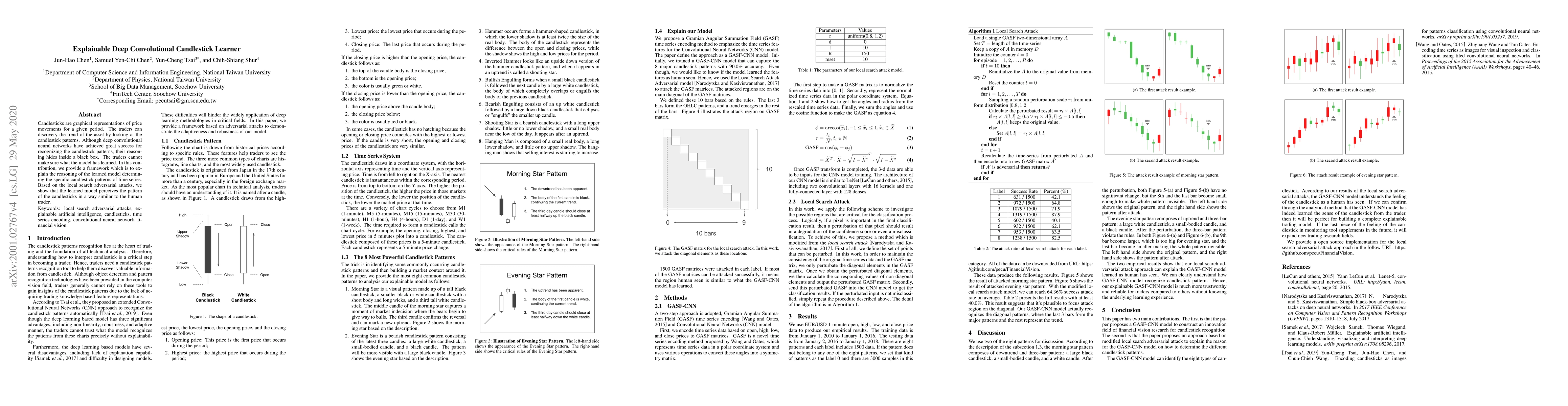 Candlesticks are graphical representations of price movements for a given period. The traders can discovery the trend of the asset by looking at the candlestick patterns. Although deep convolutional neural networks have achieved great success for recognizing the candlestick patterns, their reasoning hides inside a black box. The traders cannot make sure what the model has learned. In this contribution, we provide a framework which is to explain the reasoning of the learned model determining the specific candlestick patterns of time series. Based on the local search adversarial attacks, we show that the learned model perceives the pattern of the candlesticks in a way similar to the human trader.