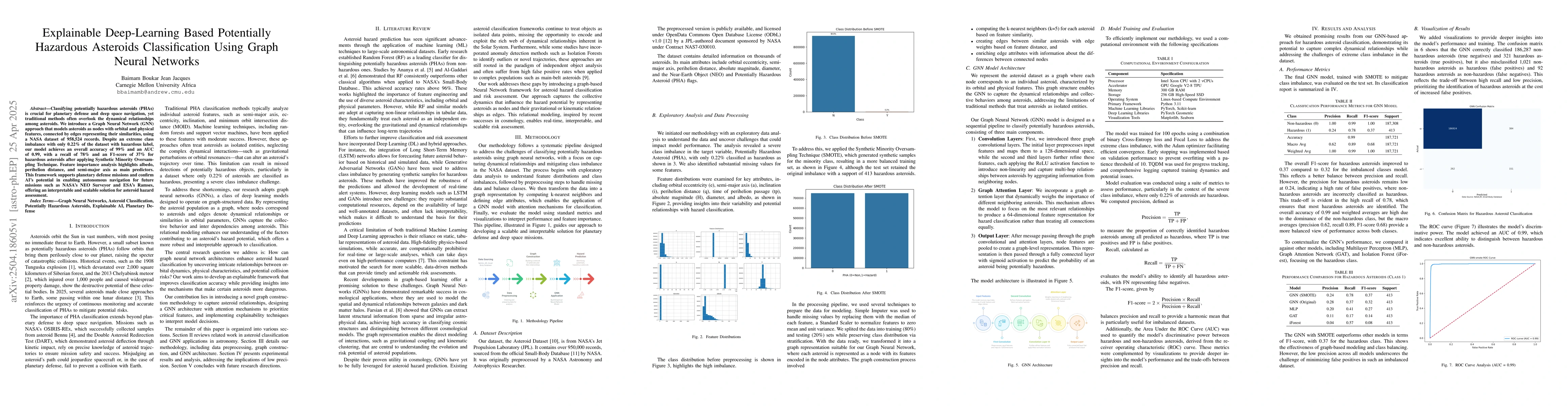 This paper proposes a Graph Neural Network (GNN) approach to classify potentially hazardous asteroids (PHAs) using a NASA dataset, achieving high accuracy and recall despite class imbalance. The model highlights key features like albedo and perihelion distance, supporting planetary defense and autonomous navigation for future space missions.