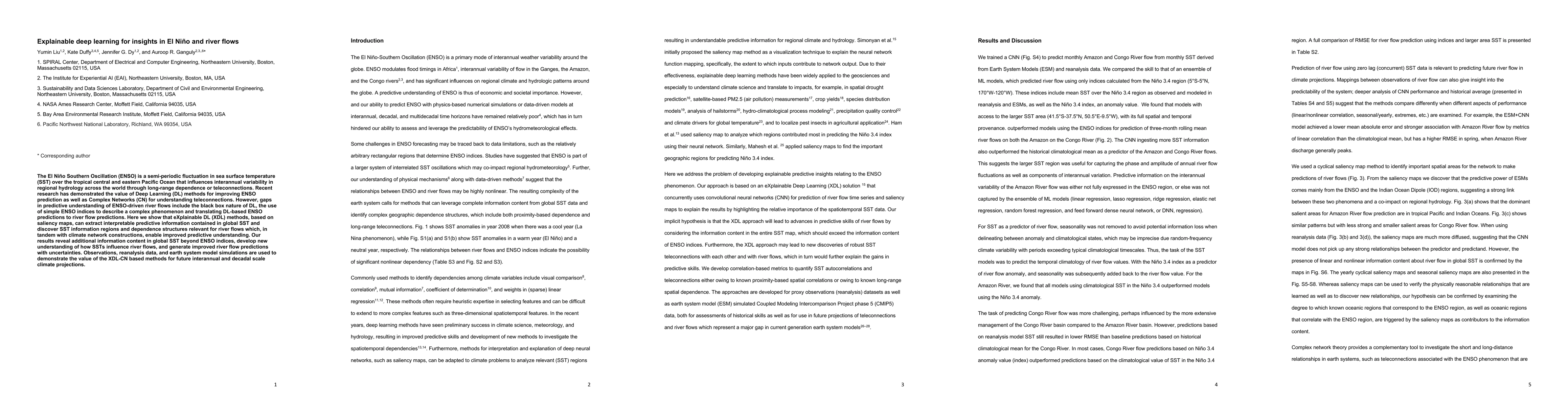 This paper explores the use of explainable deep learning (XDL) to enhance understanding and prediction of river flows influenced by the El Niño Southern Oscillation (ENSO). By leveraging saliency maps, XDL methods reveal interpretable patterns in global sea surface temperatures (SST) that improve ENSO-driven river flow predictions and provide insights into the teleconnection mechanisms.