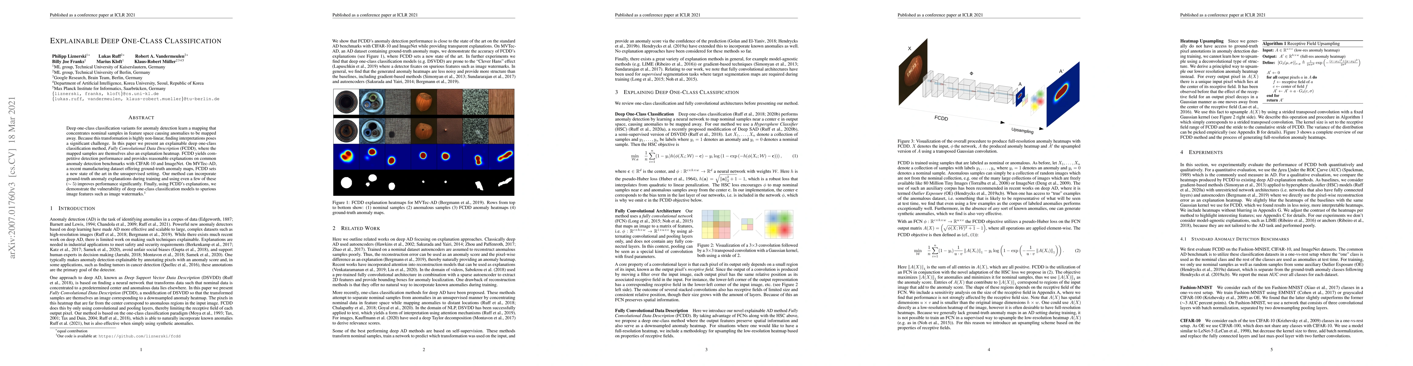 This paper introduces Fully Convolutional Data Description (FCDD), an explainable deep one-class classification method for anomaly detection that provides heatmap explanations. FCDD achieves state-of-the-art performance on unsupervised anomaly detection and demonstrates vulnerability to spurious image features.