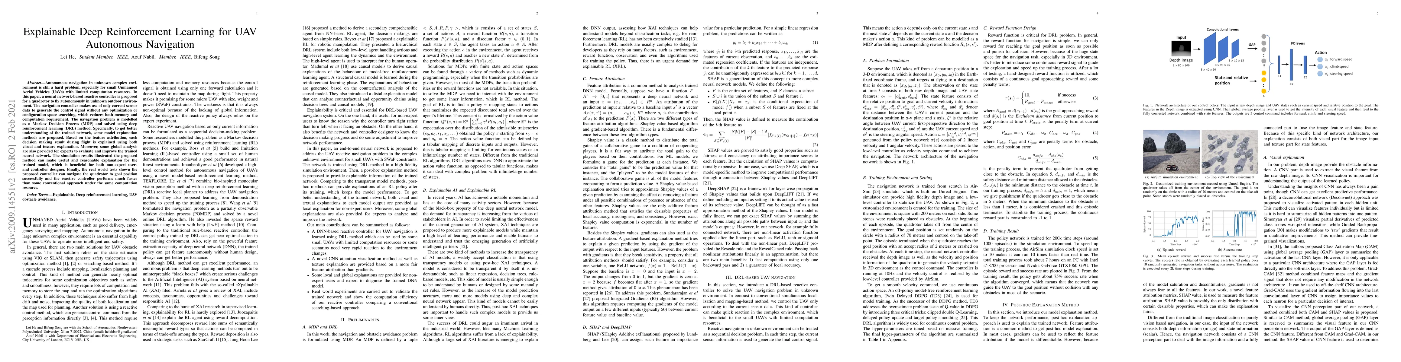 Researchers developed a neural network-based reactive controller for autonomous navigation of quadrotors in unknown outdoor environments using deep reinforcement learning. The proposed method provides explanations for the trained model, enabling better understanding and improvement.
