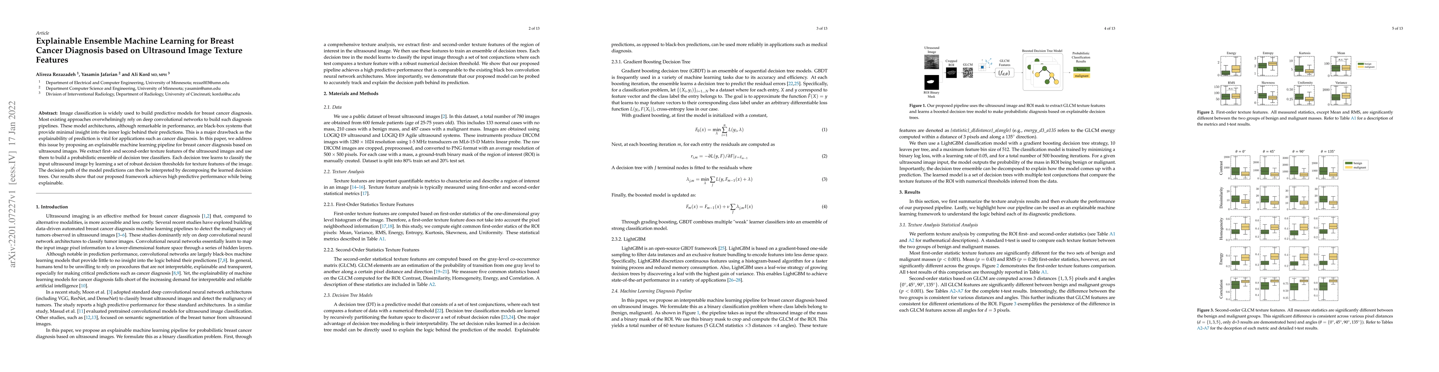 This paper proposes an explainable ensemble machine learning method for breast cancer diagnosis using ultrasound image texture features, employing a probabilistic ensemble of decision tree classifiers to achieve high performance while providing interpretable decision paths.