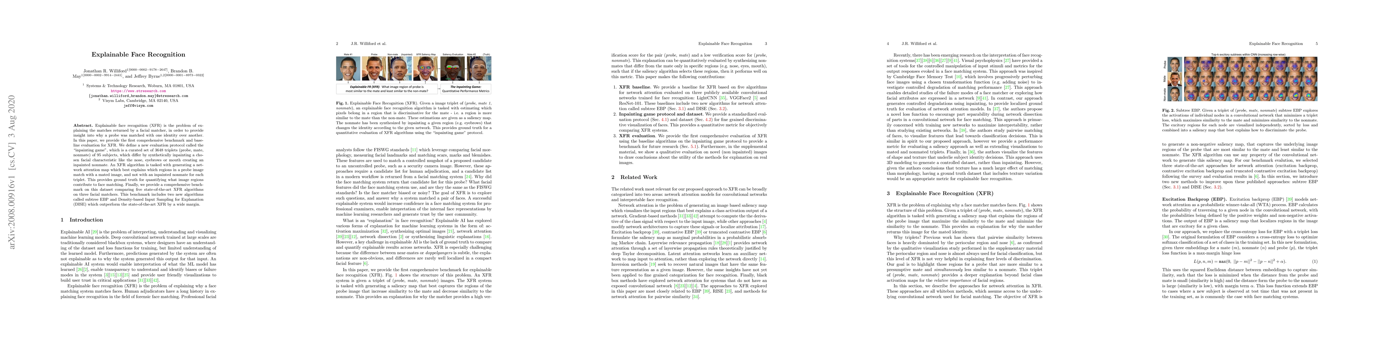 This paper introduces a benchmark for explainable face recognition, featuring a new evaluation protocol called the "inpainting game" to assess which facial regions contribute to face matching. It also presents two new network attention algorithms, subtree EBP and DISE, which outperform existing methods, enhancing transparency and trust in facial recognition systems.