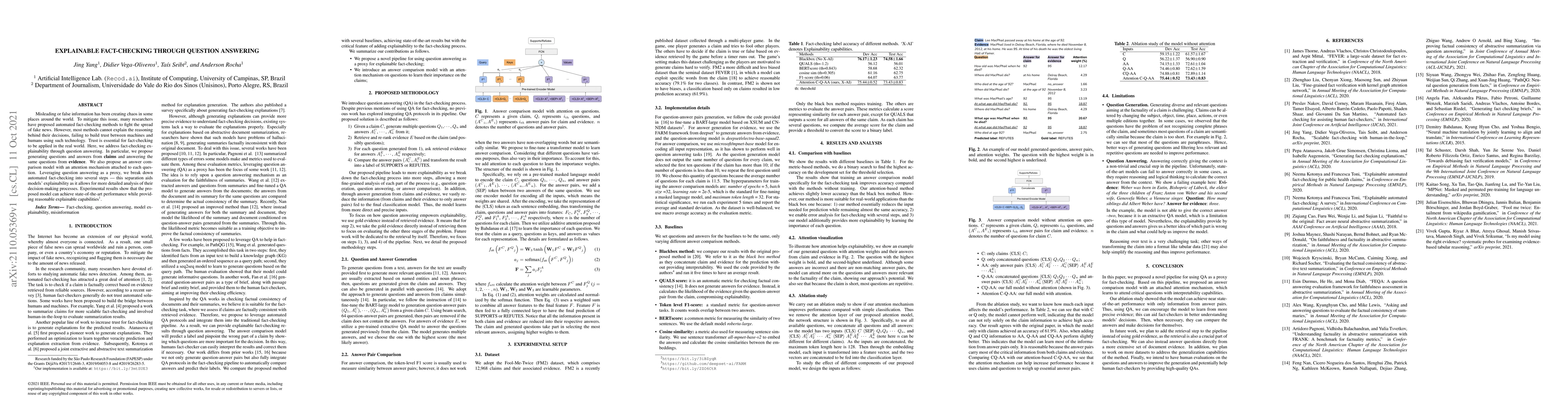 This research proposes an explainable fact-checking method using question answering to break down automated fact-checking into detailed, interpretable steps. The model generates questions and answers from claims and evidence, employing an attention mechanism for answer comparison, thereby enhancing both performance and explainability in detecting false information.