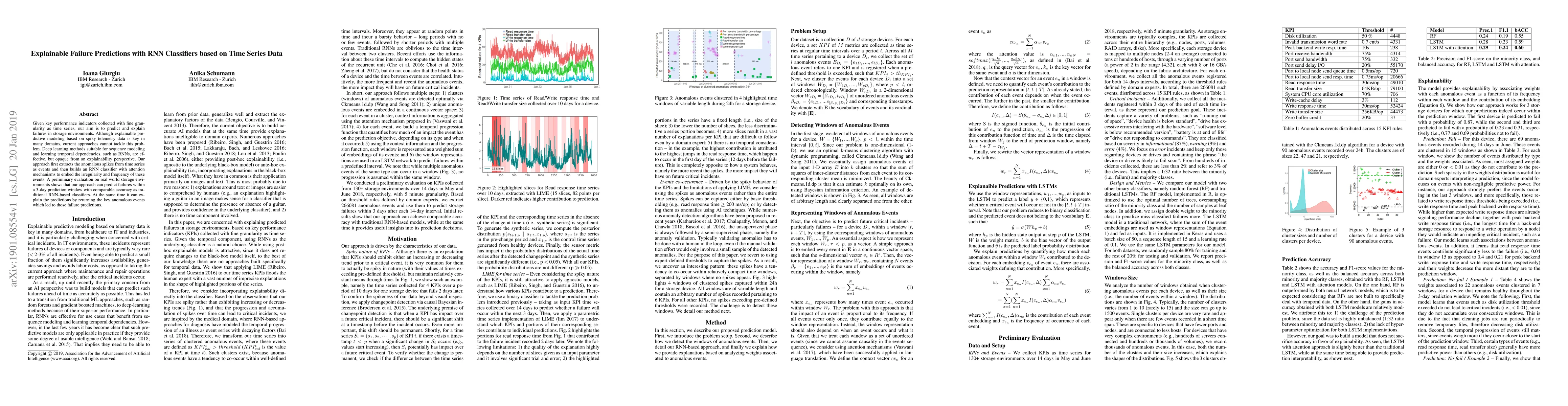 This paper proposes an RNN classifier with attention mechanisms to predict and explain failures in storage environments using time series data. The approach extracts anomalous spikes and uses the model to predict failures within a 3-day window while providing explanations through identified key events.