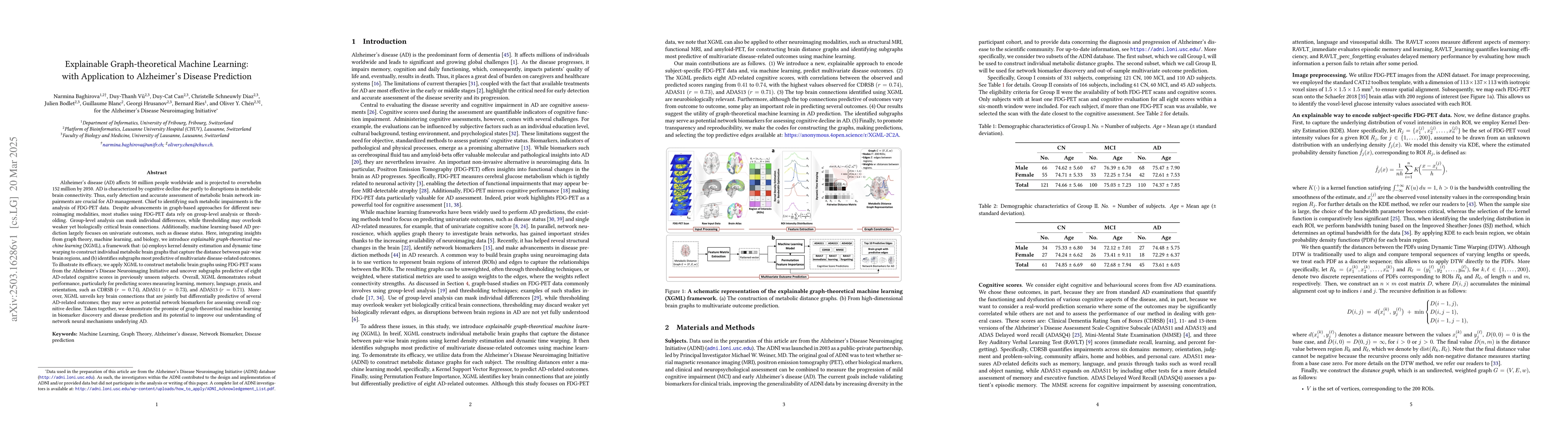 The research introduces explainable graph-theoretical machine learning (XGML), a framework that constructs individual metabolic brain graphs using FDG-PET data from the Alzheimer's Disease Neuroimaging Initiative (ADNI) dataset. XGML uses kernel density estimation and dynamic time warping to identify subgraphs most predictive of multivariate Alzheimer's-related outcomes.