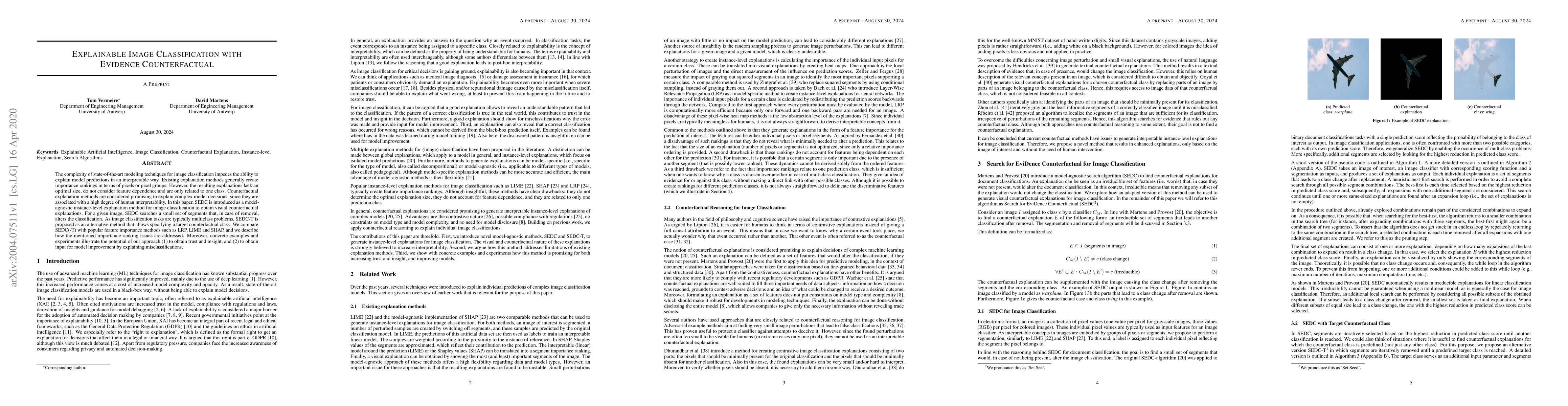 The complexity of state-of-the-art modeling techniques for image classification impedes the ability to explain model predictions in an interpretable way. Existing explanation methods generally create importance rankings in terms of pixels or pixel groups. However, the resulting explanations lack an optimal size, do not consider feature dependence and are only related to one class. Counterfactual explanation methods are considered promising to explain complex model decisions, since they are associated with a high degree of human interpretability. In this paper, SEDC is introduced as a model-agnostic instance-level explanation method for image classification to obtain visual counterfactual explanations. For a given image, SEDC searches a small set of segments that, in case of removal, alters the classification. As image classification tasks are typically multiclass problems, SEDC-T is proposed as an alternative method that allows specifying a target counterfactual class. We compare SEDC(-T) with popular feature importance methods such as LRP, LIME and SHAP, and we describe how the mentioned importance ranking issues are addressed. Moreover, concrete examples and experiments illustrate the potential of our approach (1) to obtain trust and insight, and (2) to obtain input for model improvement by explaining misclassifications.