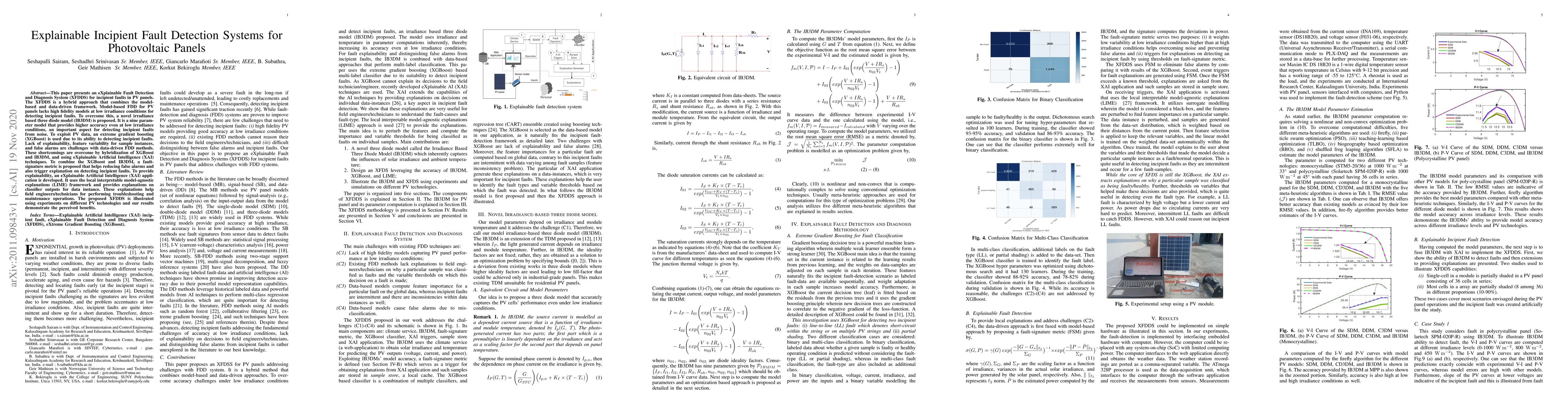 This paper proposes an eXplainable Fault Detection and Diagnosis System (XFDDS) for photovoltaic panels that combines model-based and data-driven frameworks to detect incipient faults, utilizing a novel irradiance-based three diode model (IB3DM) and extreme gradient boosting (XGBoost) with explainable AI (XAI) techniques to improve accuracy and reduce false alarms.