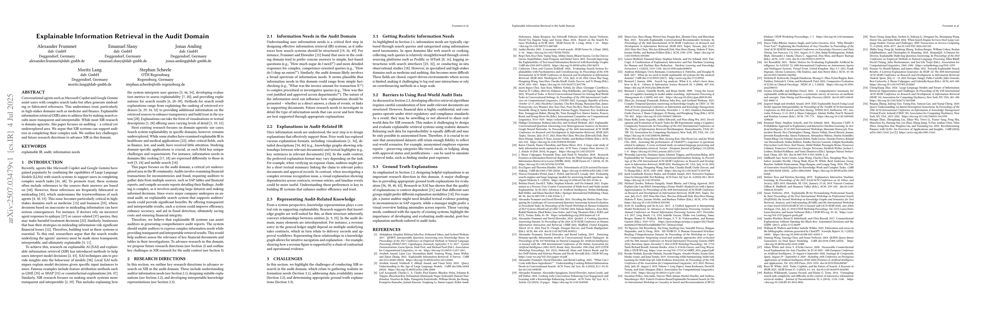 Conversational agents such as Microsoft Copilot and Google Gemini assist users with complex search tasks but often generate misleading or fabricated references. This undermines trust, particularly in high-stakes domains such as medicine and finance. Explainable information retrieval (XIR) aims to address this by making search results more transparent and interpretable. While most XIR research is domain-agnostic, this paper focuses on auditing -- a critical yet underexplored area. We argue that XIR systems can support auditors in completing their complex task. We outline key challenges and future research directions to advance XIR in this domain.