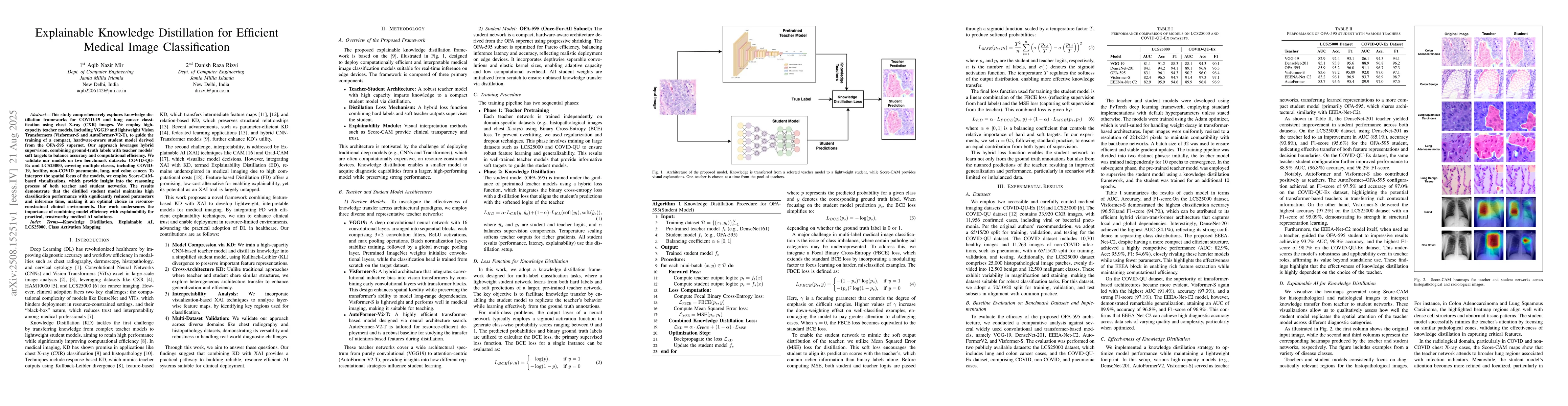 This study comprehensively explores knowledge distillation frameworks for COVID-19 and lung cancer classification using chest X-ray (CXR) images. We employ high-capacity teacher models, including VGG19 and lightweight Vision Transformers (Visformer-S and AutoFormer-V2-T), to guide the training of a compact, hardware-aware student model derived from the OFA-595 supernet. Our approach leverages hybrid supervision, combining ground-truth labels with teacher models' soft targets to balance accuracy and computational efficiency. We validate our models on two benchmark datasets: COVID-QU-Ex and LCS25000, covering multiple classes, including COVID-19, healthy, non-COVID pneumonia, lung, and colon cancer. To interpret the spatial focus of the models, we employ Score-CAM-based visualizations, which provide insight into the reasoning process of both teacher and student networks. The results demonstrate that the distilled student model maintains high classification performance with significantly reduced parameters and inference time, making it an optimal choice in resource-constrained clinical environments. Our work underscores the importance of combining model efficiency with explainability for practical, trustworthy medical AI solutions.