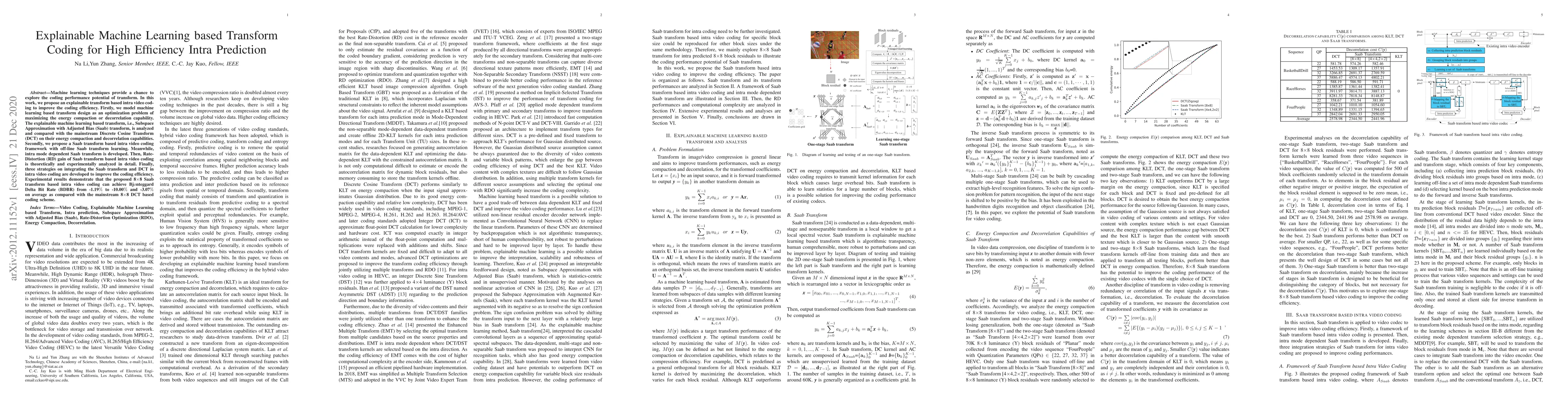 The paper proposes an explainable machine learning-based transform, Saab, for intra video coding, optimizing energy compaction or decorrelation capability. It compares Saab with DCT, analyzes RD gain, and develops strategies for integrating Saab and DCT in intra video coding.