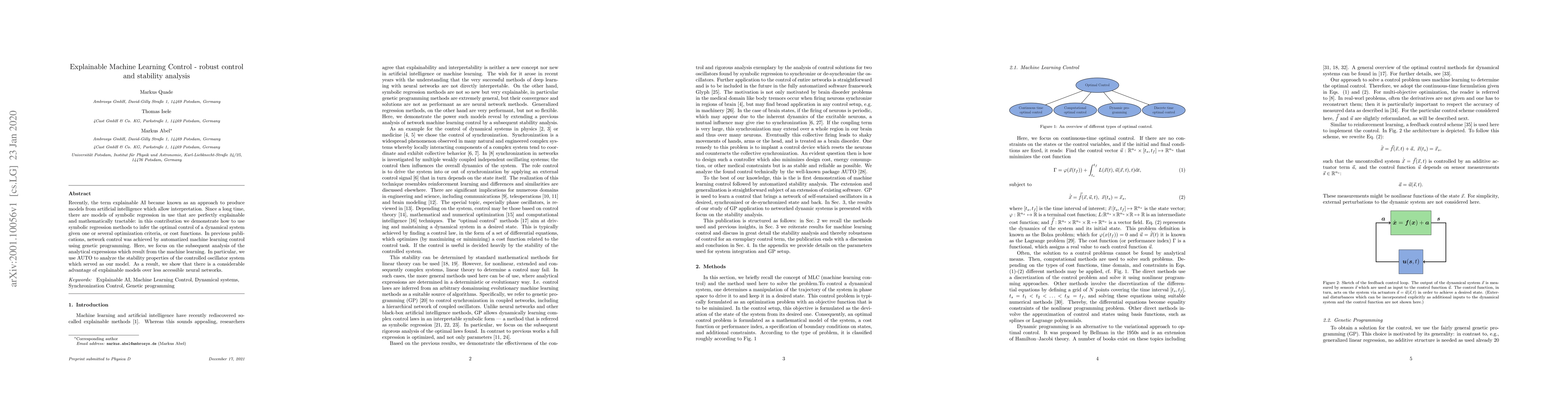 Recently, the term explainable AI became known as an approach to produce models from artificial intelligence which allow interpretation. Since a long time, there are models of symbolic regression in use that are perfectly explainable and mathematically tractable: in this contribution we demonstrate how to use symbolic regression methods to infer the optimal control of a dynamical system given one or several optimization criteria, or cost functions. In previous publications, network control was achieved by automatized machine learning control using genetic programming. Here, we focus on the subsequent analysis of the analytical expressions which result from the machine learning. In particular, we use AUTO to analyze the stability properties of the controlled oscillator system which served as our model. As a result, we show that there is a considerable advantage of explainable models over less accessible neural networks.