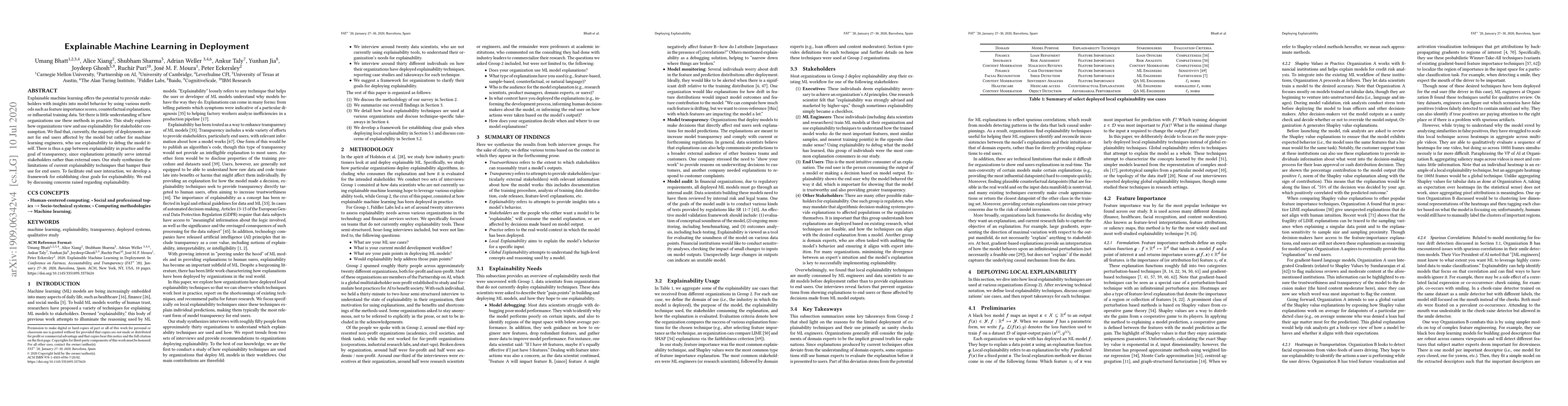 This study investigates how organizations implement explainable machine learning, finding that most deployments serve internal machine learning engineers for debugging rather than end users. The research highlights a gap between current practices and the goal of transparency, and proposes a framework to better align explainability with end user needs.