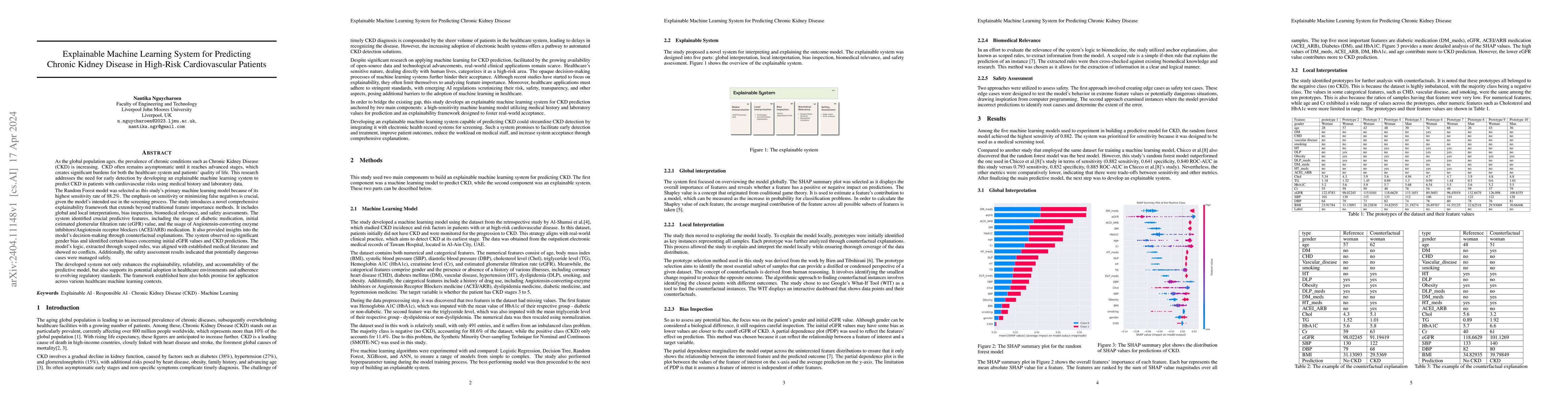 This research developed an explainable machine learning system using Random Forest to predict Chronic Kidney Disease (CKD) in high-risk cardiovascular patients, achieving 88.2% sensitivity. The system incorporates comprehensive explainability, including global and local interpretations, bias inspection, biomedical relevance, and safety assessments, ensuring its potential integration into healthcare settings.