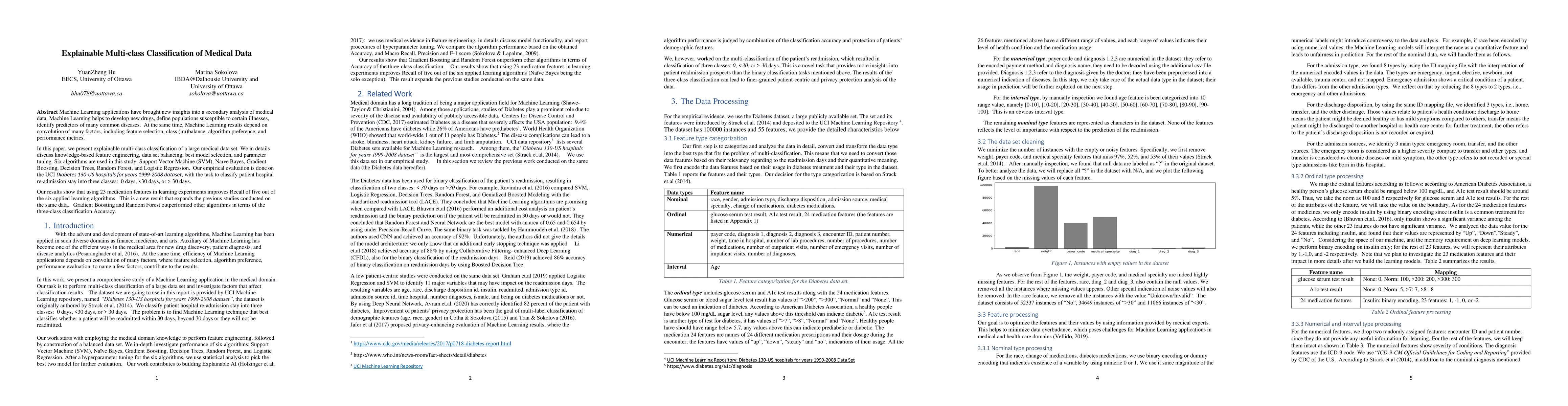 Machine Learning applications have brought new insights into a secondary analysis of medical data. Machine Learning helps to develop new drugs, define populations susceptible to certain illnesses, identify predictors of many common diseases. At the same time, Machine Learning results depend on convolution of many factors, including feature selection, class (im)balance, algorithm preference, and performance metrics. In this paper, we present explainable multi-class classification of a large medical data set. We in details discuss knowledge-based feature engineering, data set balancing, best model selection, and parameter tuning. Six algorithms are used in this study: Support Vector Machine (SVM), Na\"ive Bayes, Gradient Boosting, Decision Trees, Random Forest, and Logistic Regression. Our empirical evaluation is done on the UCI Diabetes 130-US hospitals for years 1999-2008 dataset, with the task to classify patient hospital re-admission stay into three classes: 0 days, <30 days, or > 30 days. Our results show that using 23 medication features in learning experiments improves Recall of five out of the six applied learning algorithms. This is a new result that expands the previous studies conducted on the same data. Gradient Boosting and Random Forest outperformed other algorithms in terms of the three-class classification Accuracy.