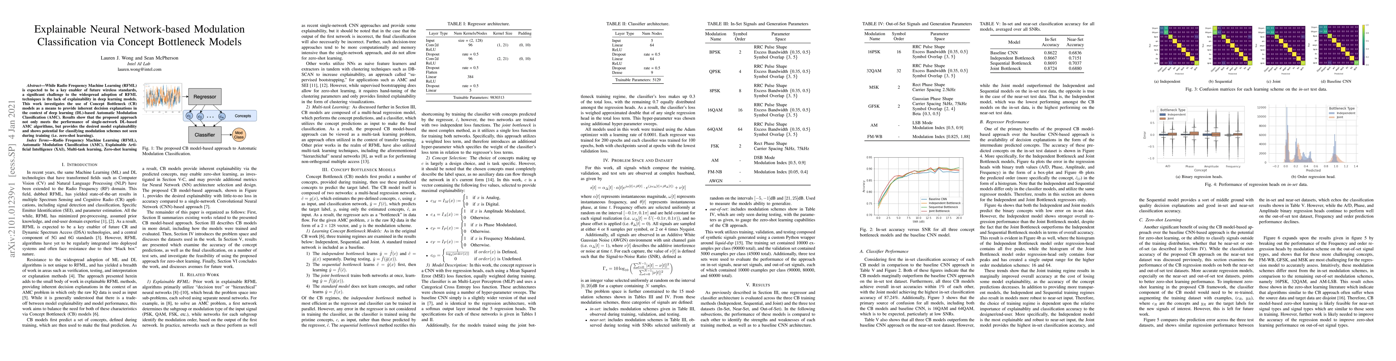This research introduces Concept Bottleneck (CB) models to enhance explainability in deep learning-based modulation classification for Radio Frequency Machine Learning (RFML). The method maintains performance parity with traditional deep learning models while offering transparent decision-making. It also demonstrates potential for classifying unseen modulation schemes, indicating zero-shot learning capability.