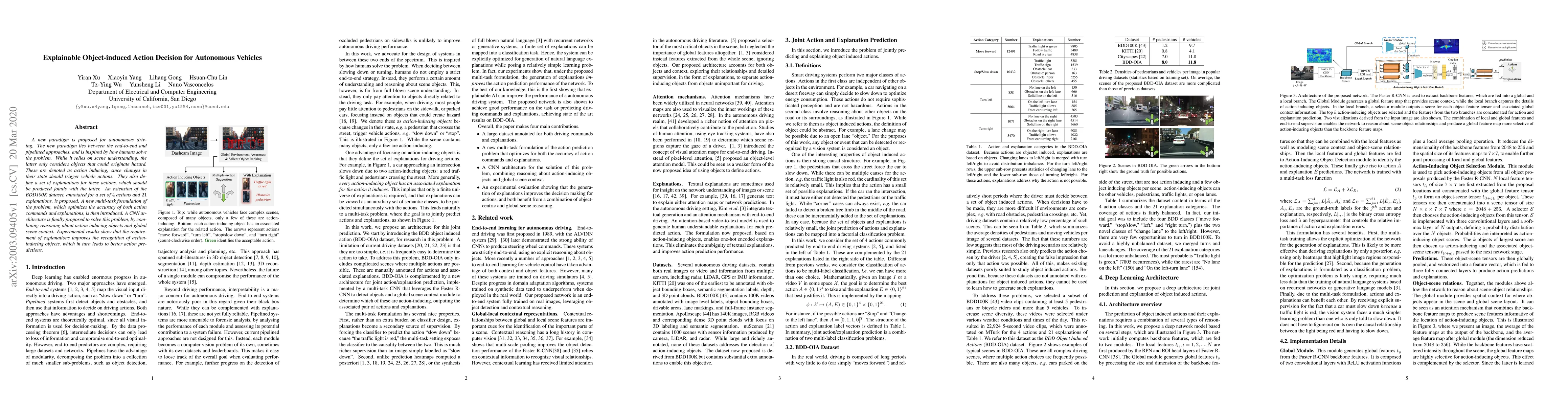 A new paradigm is proposed for autonomous driving. The new paradigm lies between the end-to-end and pipelined approaches, and is inspired by how humans solve the problem. While it relies on scene understanding, the latter only considers objects that could originate hazard. These are denoted as action-inducing, since changes in their state should trigger vehicle actions. They also define a set of explanations for these actions, which should be produced jointly with the latter. An extension of the BDD100K dataset, annotated for a set of 4 actions and 21 explanations, is proposed. A new multi-task formulation of the problem, which optimizes the accuracy of both action commands and explanations, is then introduced. A CNN architecture is finally proposed to solve this problem, by combining reasoning about action inducing objects and global scene context. Experimental results show that the requirement of explanations improves the recognition of action-inducing objects, which in turn leads to better action predictions.