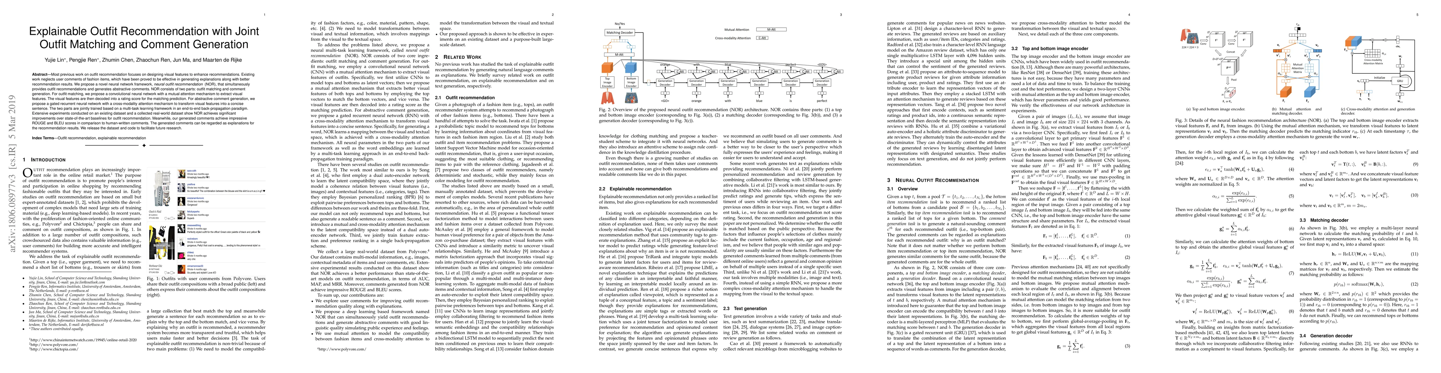 This paper introduces a neural network framework called neural outfit recommendation (NOR) that provides outfit recommendations and generates explanatory comments. NOR uses a convolutional neural network with mutual attention for visual feature extraction and a gated recurrent neural network for comment generation, both jointly trained to improve recommendation accuracy and explanation quality.