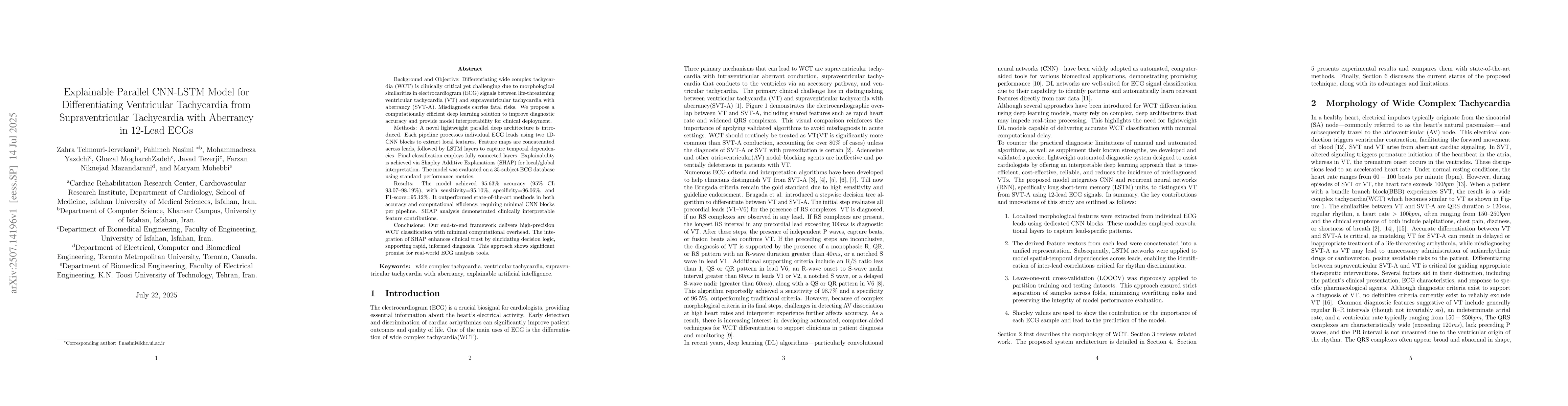 Background and Objective: Differentiating wide complex tachycardia (WCT) is clinically critical yet challenging due to morphological similarities in electrocardiogram (ECG) signals between life-threatening ventricular tachycardia (VT) and supraventricular tachycardia with aberrancy (SVT-A). Misdiagnosis carries fatal risks. We propose a computationally efficient deep learning solution to improve diagnostic accuracy and provide model interpretability for clinical deployment. Methods: A novel lightweight parallel deep architecture is introduced. Each pipeline processes individual ECG leads using two 1D-CNN blocks to extract local features. Feature maps are concatenated across leads, followed by LSTM layers to capture temporal dependencies. Final classification employs fully connected layers. Explainability is achieved via Shapley Additive Explanations (SHAP) for local/global interpretation. The model was evaluated on a 35-subject ECG database using standard performance metrics. Results: The model achieved $95.63\%$ accuracy ($95\%$ CI: $93.07-98.19\%$), with sensitivity=$95.10\%$, specificity=$96.06\%$, and F1-score=$95.12\%$. It outperformed state-of-the-art methods in both accuracy and computational efficiency, requiring minimal CNN blocks per pipeline. SHAP analysis demonstrated clinically interpretable feature contributions. Conclusions: Our end-to-end framework delivers high-precision WCT classification with minimal computational overhead. The integration of SHAP enhances clinical trust by elucidating decision logic, supporting rapid, informed diagnosis. This approach shows significant promise for real-world ECG analysis tools.