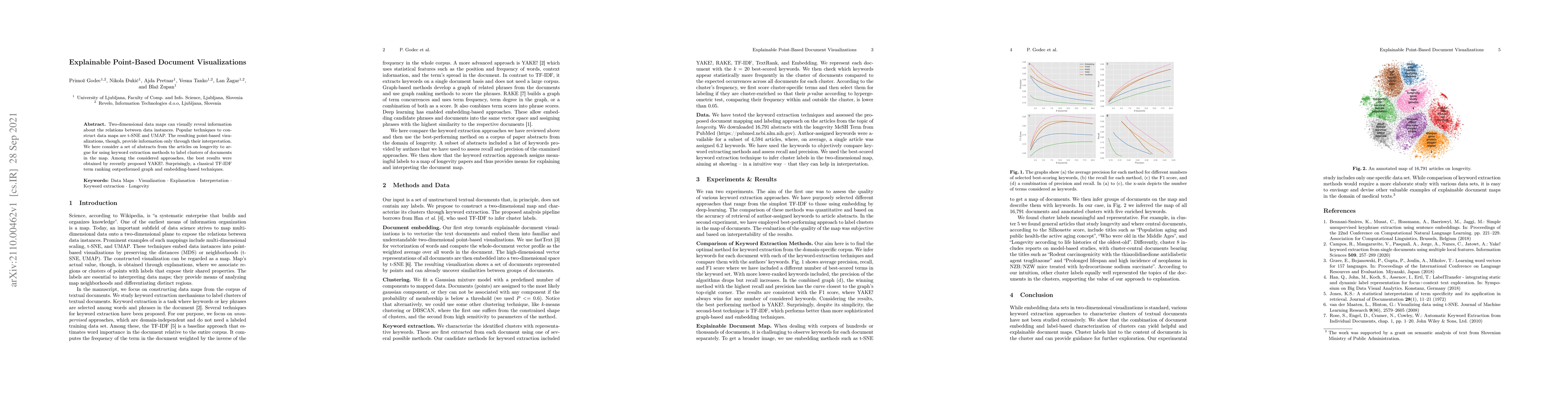 Two-dimensional data maps can visually reveal information about the relations between data instances. Popular techniques to construct data maps are t-SNE and UMAP. The resulting point-based visualizations, though, provide information only through their interpretation. We here consider a set of abstracts from the articles on longevity to argue for using keyword extraction methods to label clusters of documents in the map. Among the considered approaches, the best results were obtained by recently proposed YAKE!. Surprisingly, a classical TF-IDF term ranking outperformed graph and embedding-based techniques.