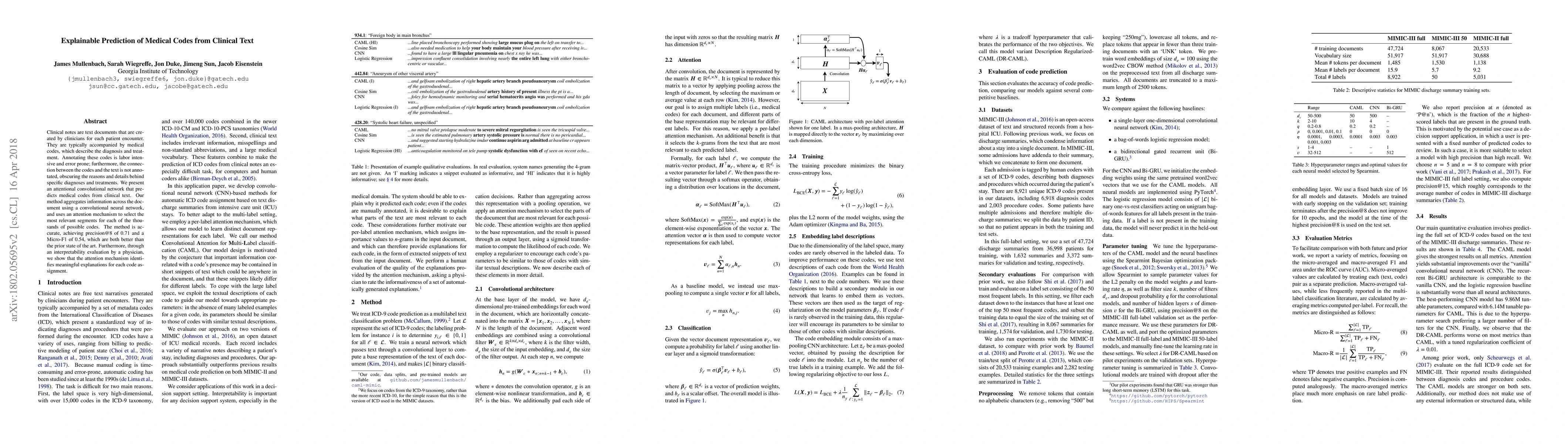 This paper introduces an attentional convolutional network to predict medical codes from clinical text, achieving better accuracy than previous methods. It uses an attention mechanism to highlight relevant text segments, providing interpretable explanations for the code assignments.