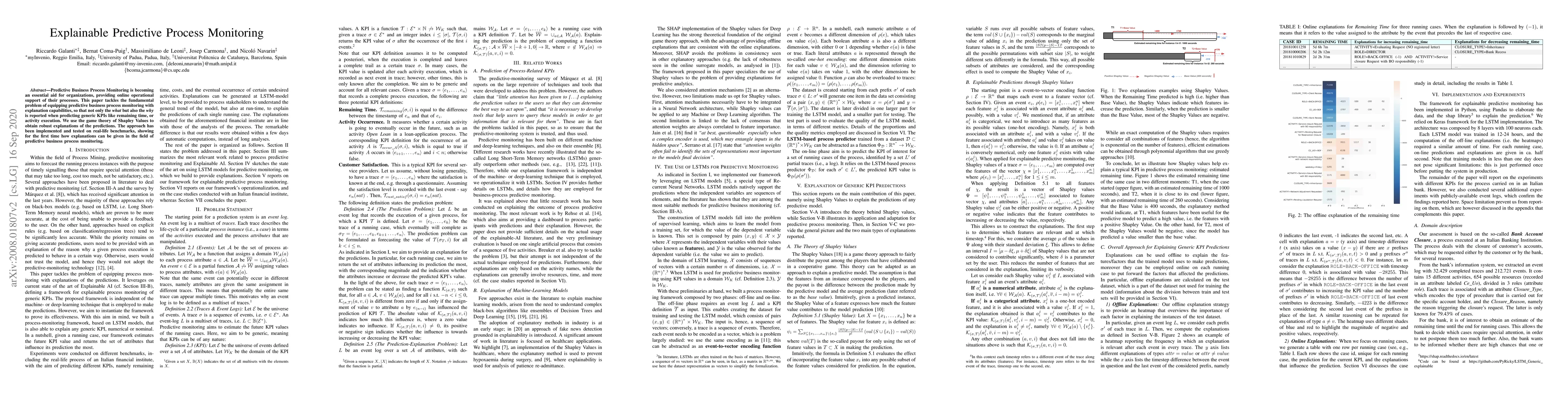 This paper introduces a method to enhance predictive business process monitoring by providing explanations for its predictions using Shapley Values from game theory. The approach was tested on real-life benchmarks, demonstrating the first practical implementation of explainable predictive monitoring for key performance indicators.