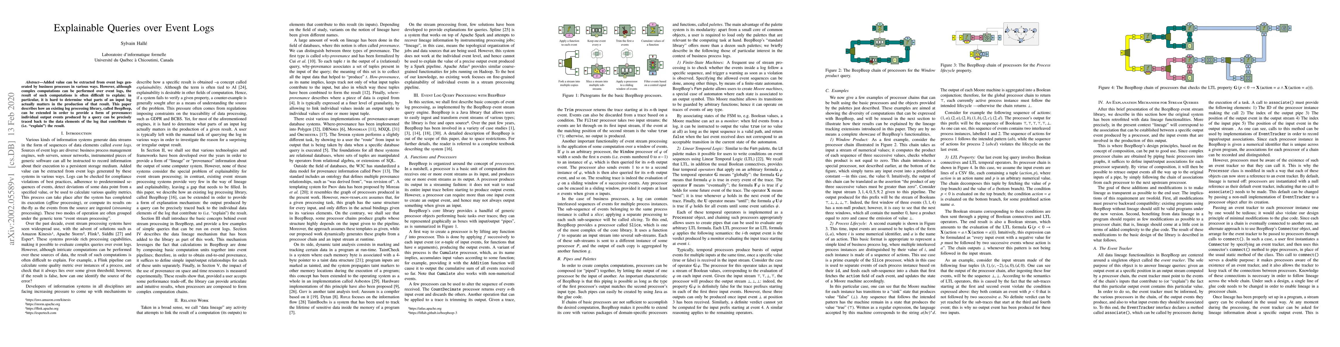 This paper extends a log processing library to provide provenance, allowing users to trace back individual output events in event logs to the contributing data elements. This enables more explainable queries over event logs.