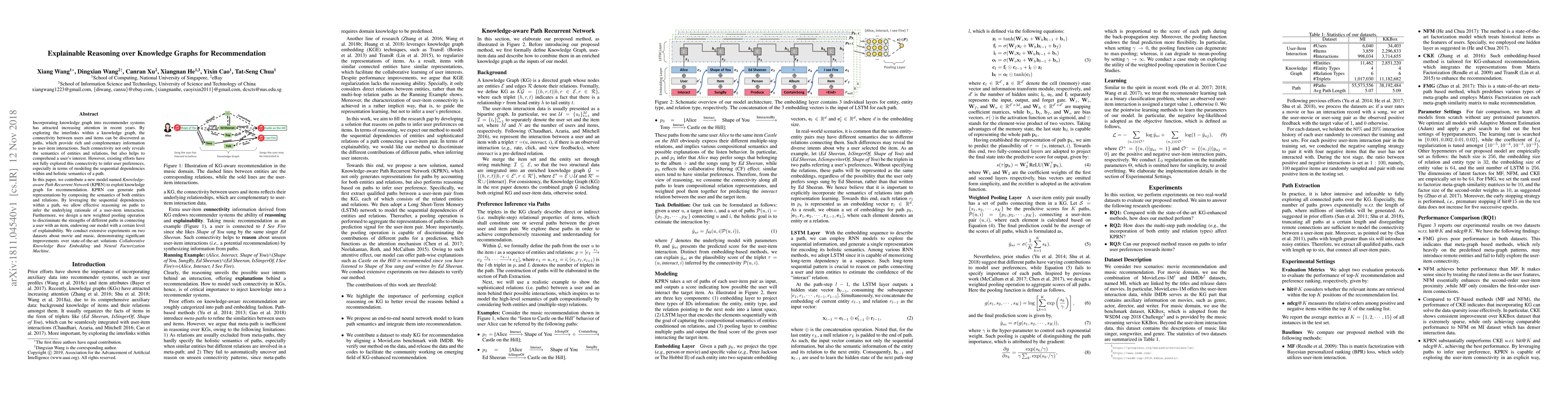 A new model called Knowledge-aware Path Recurrent Network (KPRN) is proposed to exploit knowledge graphs for recommendation, leveraging sequential dependencies within paths to infer user preferences and provide explainability.
