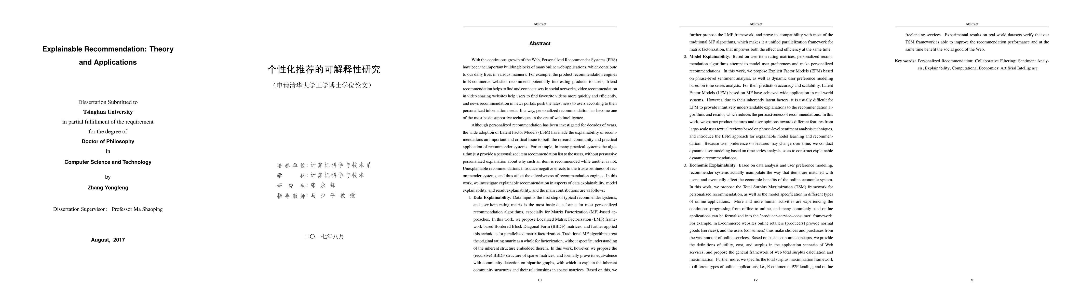 Although personalized recommendation has been investigated for decades, the wide adoption of Latent Factor Models (LFM) has made the explainability of recommendations a critical issue to both the research community and practical application of recommender systems. For example, in many practical systems the algorithm just provides a personalized item recommendation list to the users, without persuasive personalized explanation about why such an item is recommended while another is not. Unexplainable recommendations introduce negative effects to the trustworthiness of recommender systems, and thus affect the effectiveness of recommendation engines. In this work, we investigate explainable recommendation in aspects of data explainability, model explainability, and result explainability, and the main contributions are as follows: 1. Data Explainability: We propose Localized Matrix Factorization (LMF) framework based Bordered Block Diagonal Form (BBDF) matrices, and further applied this technique for parallelized matrix factorization. 2. Model Explainability: We propose Explicit Factor Models (EFM) based on phrase-level sentiment analysis, as well as dynamic user preference modeling based on time series analysis. In this work, we extract product features and user opinions towards different features from large-scale user textual reviews based on phrase-level sentiment analysis techniques, and introduce the EFM approach for explainable model learning and recommendation. 3. Economic Explainability: We propose the Total Surplus Maximization (TSM) framework for personalized recommendation, as well as the model specification in different types of online applications. Based on basic economic concepts, we provide the definitions of utility, cost, and surplus in the application scenario of Web services, and propose the general framework of web total surplus calculation and maximization.