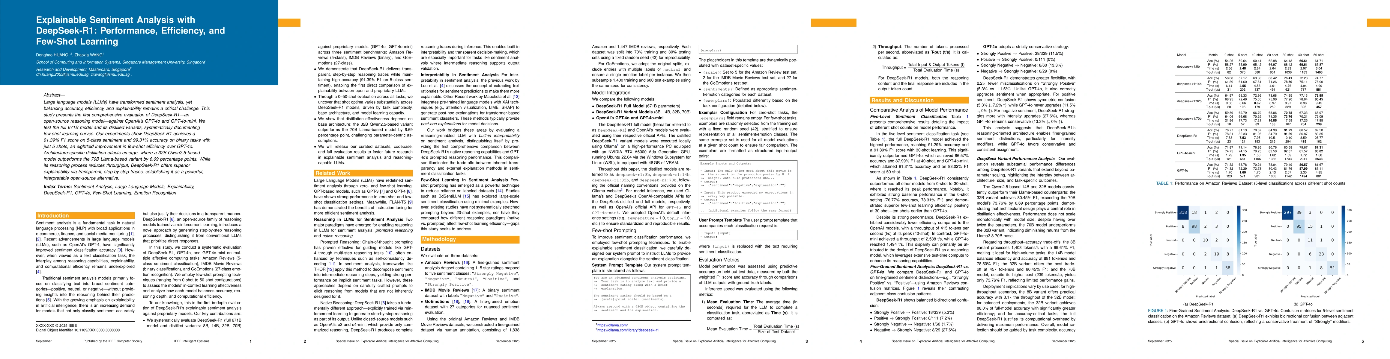 Large language models (LLMs) have transformed sentiment analysis, yet balancing accuracy, efficiency, and explainability remains a critical challenge. This study presents the first comprehensive evaluation of DeepSeek-R1--an open-source reasoning model--against OpenAI's GPT-4o and GPT-4o-mini. We test the full 671B model and its distilled variants, systematically documenting few-shot learning curves. Our experiments show DeepSeek-R1 achieves a 91.39\% F1 score on 5-class sentiment and 99.31\% accuracy on binary tasks with just 5 shots, an eightfold improvement in few-shot efficiency over GPT-4o. Architecture-specific distillation effects emerge, where a 32B Qwen2.5-based model outperforms the 70B Llama-based variant by 6.69 percentage points. While its reasoning process reduces throughput, DeepSeek-R1 offers superior explainability via transparent, step-by-step traces, establishing it as a powerful, interpretable open-source alternative.