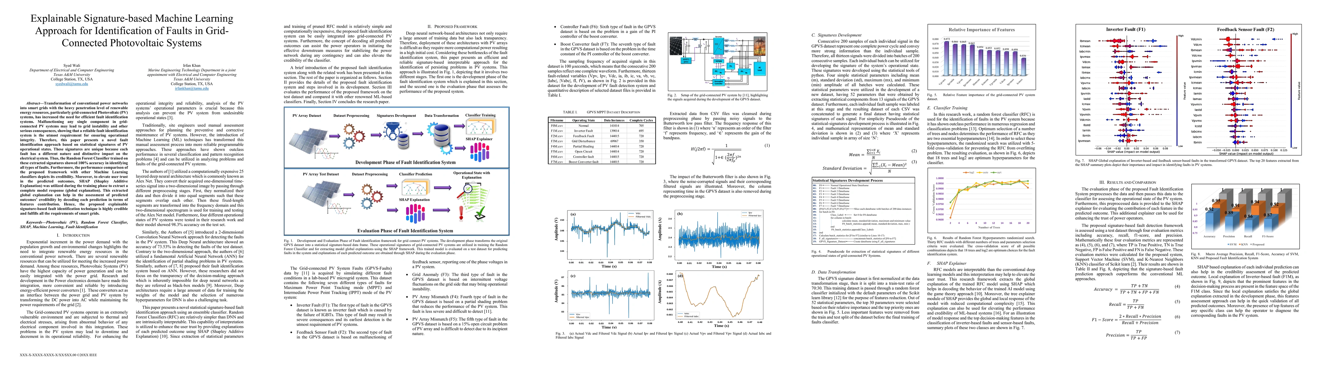 This paper introduces a novel fault identification method for grid-connected photovoltaic systems using statistical signatures and a Random Forest Classifier, achieving 100% accuracy. To enhance user trust, SHAP is employed for global model explanation, ensuring the technique's reliability and compliance with smart grid requirements.