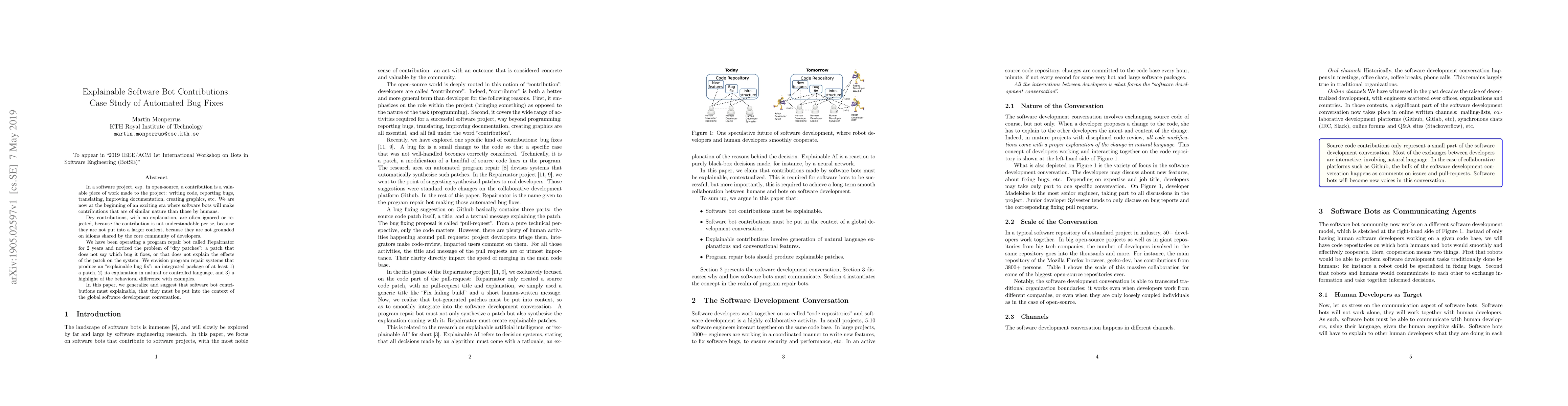 In a software project, esp. in open-source, a contribution is a valuable piece of work made to the project: writing code, reporting bugs, translating, improving documentation, creating graphics, etc. We are now at the beginning of an exciting era where software bots will make contributions that are of similar nature than those by humans. Dry contributions, with no explanation, are often ignored or rejected, because the contribution is not understandable per se, because they are not put into a larger context, because they are not grounded on idioms shared by the core community of developers. We have been operating a program repair bot called Repairnator for 2 years and noticed the problem of "dry patches": a patch that does not say which bug it fixes, or that does not explain the effects of the patch on the system. We envision program repair systems that produce an "explainable bug fix": an integrated package of at least 1) a patch, 2) its explanation in natural or controlled language, and 3) a highlight of the behavioral difference with examples. In this paper, we generalize and suggest that software bot contributions must explainable, that they must be put into the context of the global software development conversation.