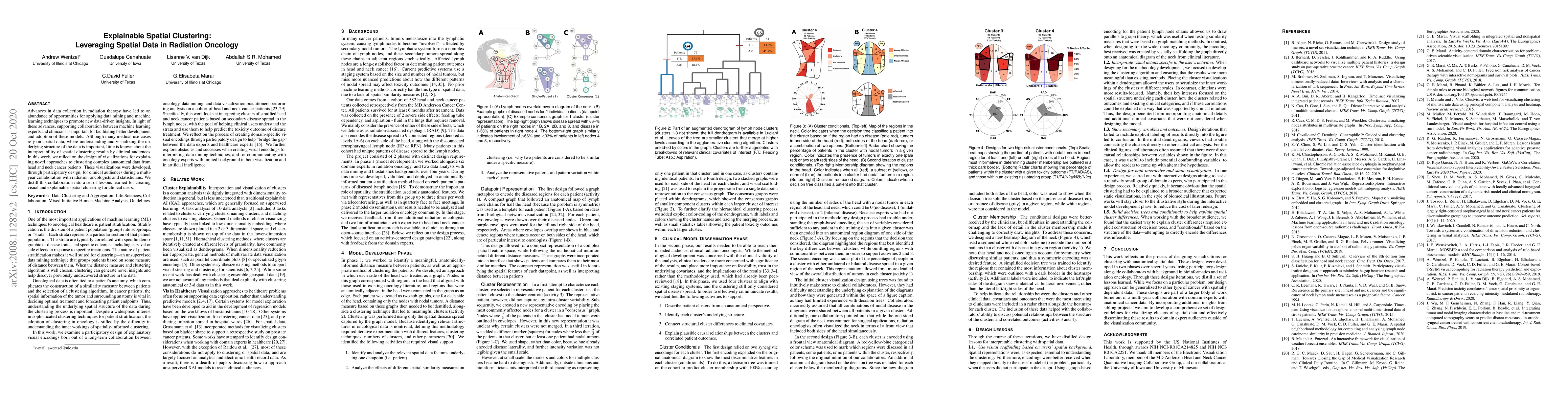 This paper explores the development of interpretable spatial clustering techniques for radiation oncology data, focusing on head and neck cancer patients. Through a multi-year collaboration with clinicians and statisticians, it presents visualizations designed to enhance understanding and adoption of these techniques by clinical audiences.