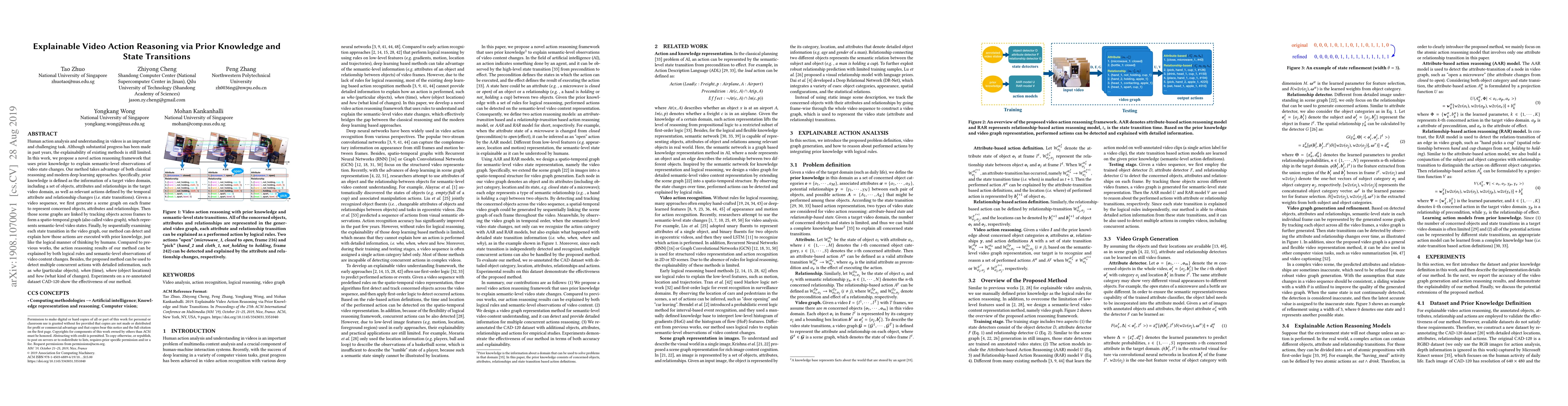 This research introduces a novel video action reasoning framework that uses prior knowledge and state transitions to explain semantic-level observations. It generates scene graphs for each frame, links them to form a spatio-temporal graph, and examines state transitions to detect and explain actions, providing detailed information like 'who', 'when', 'where', and 'how'. The method outperforms previous works in explainability and concurrent action detection, as demonstrated on the CAD-120 dataset.