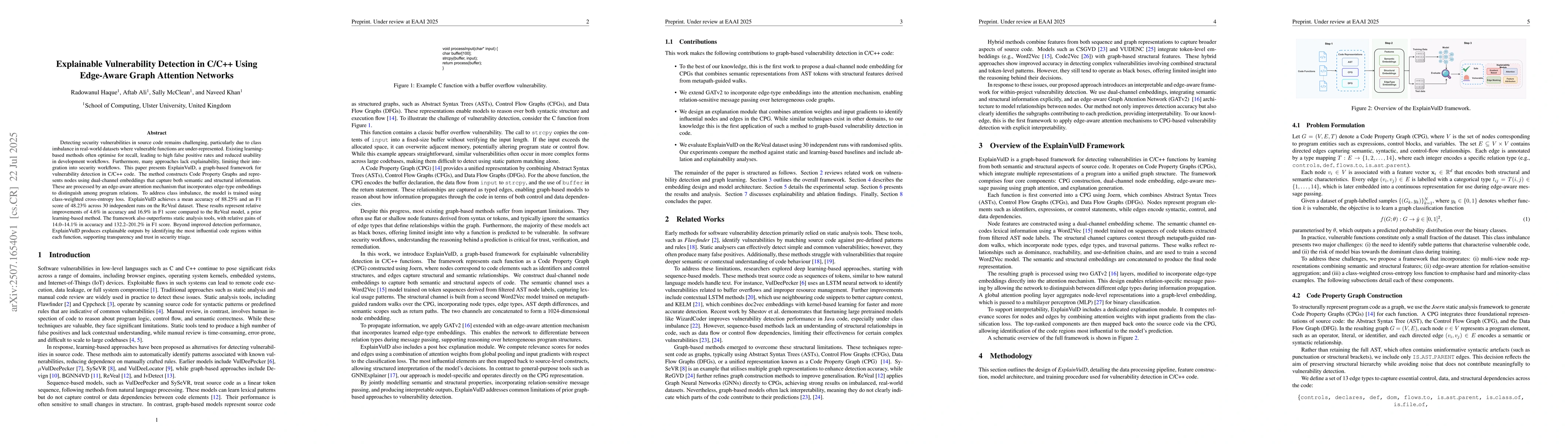 Detecting security vulnerabilities in source code remains challenging, particularly due to class imbalance in real-world datasets where vulnerable functions are under-represented. Existing learning-based methods often optimise for recall, leading to high false positive rates and reduced usability in development workflows. Furthermore, many approaches lack explainability, limiting their integration into security workflows. This paper presents ExplainVulD, a graph-based framework for vulnerability detection in C/C++ code. The method constructs Code Property Graphs and represents nodes using dual-channel embeddings that capture both semantic and structural information. These are processed by an edge-aware attention mechanism that incorporates edge-type embeddings to distinguish among program relations. To address class imbalance, the model is trained using class-weighted cross-entropy loss. ExplainVulD achieves a mean accuracy of 88.25 percent and an F1 score of 48.23 percent across 30 independent runs on the ReVeal dataset. These results represent relative improvements of 4.6 percent in accuracy and 16.9 percent in F1 score compared to the ReVeal model, a prior learning-based method. The framework also outperforms static analysis tools, with relative gains of 14.0 to 14.1 percent in accuracy and 132.2 to 201.2 percent in F1 score. Beyond improved detection performance, ExplainVulD produces explainable outputs by identifying the most influential code regions within each function, supporting transparency and trust in security triage.