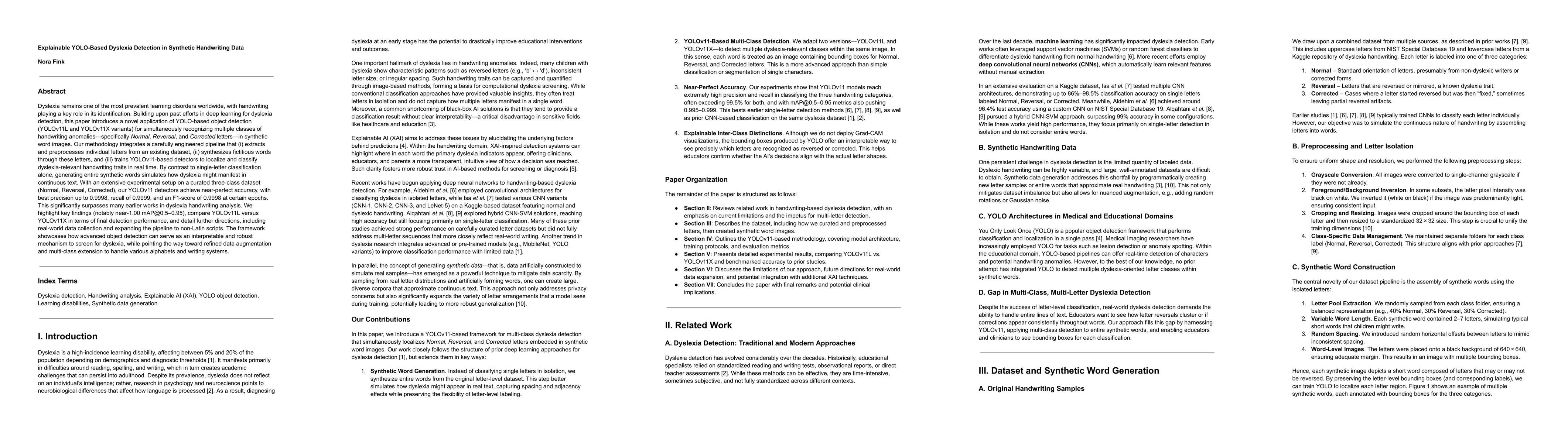 This paper proposes a YOLO-based framework for detecting dyslexia traits in synthetic handwriting data by classifying handwriting patterns (Normal, Reversal, Corrected) at both letter and word levels, achieving high precision and recall. Unlike previous single-letter CNN methods, this approach analyzes complete word images for more realistic results, though it currently relies on synthetic data and future work aims to address real-world applicability and deeper explainability.