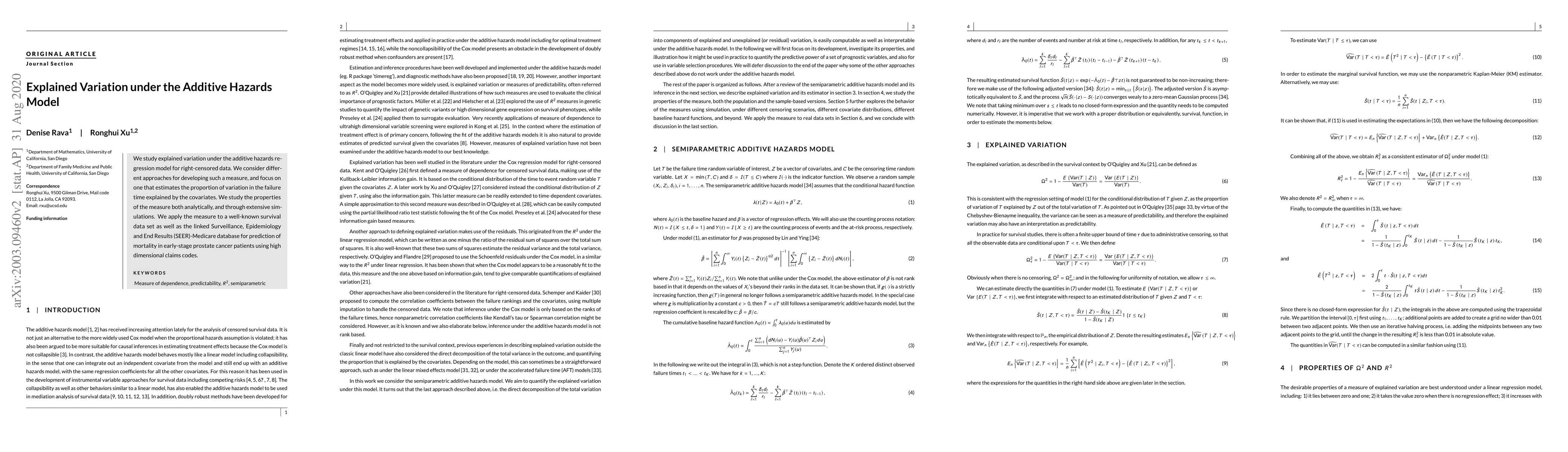 We study explained variation under the additive hazards regression model for right-censored data. We consider different approaches for developing such a measure, and focus on one that estimates the proportion of variation in the failure time explained by the covariates. We study the properties of the measure both analytically, and through extensive simulations. We apply the measure to a well-known survival data set as well as the linked Surveillance, Epidemiology and End Results (SEER)-Medicare database for prediction of mortality in early-stage prostate cancer patients using high dimensional claims codes.