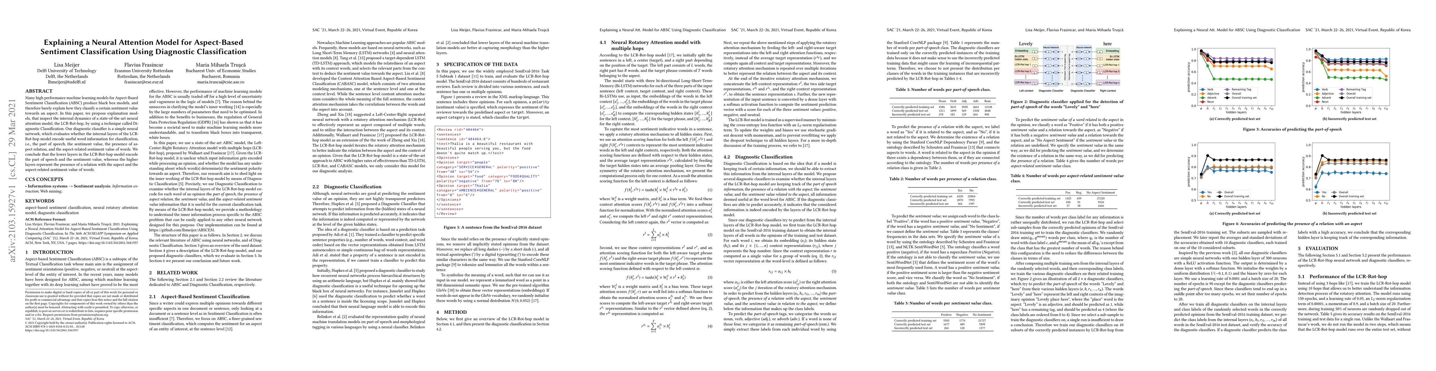 Many high performance machine learning models for Aspect-Based Sentiment Classification (ABSC) produce black box models, and therefore barely explain how they classify a certain sentiment value towards an aspect. In this paper, we propose explanation models, that inspect the internal dynamics of a state-of-the-art neural attention model, the LCR-Rot-hop, by using a technique called Diagnostic Classification. Our diagnostic classifier is a simple neural network, which evaluates whether the internal layers of the LCR-Rot-hop model encode useful word information for classification, i.e., the part of speech, the sentiment value, the presence of aspect relation, and the aspect-related sentiment value of words. We conclude that the lower layers in the LCR-Rot-hop model encode the part of speech and the sentiment value, whereas the higher layers represent the presence of a relation with the aspect and the aspect-related sentiment value of words.