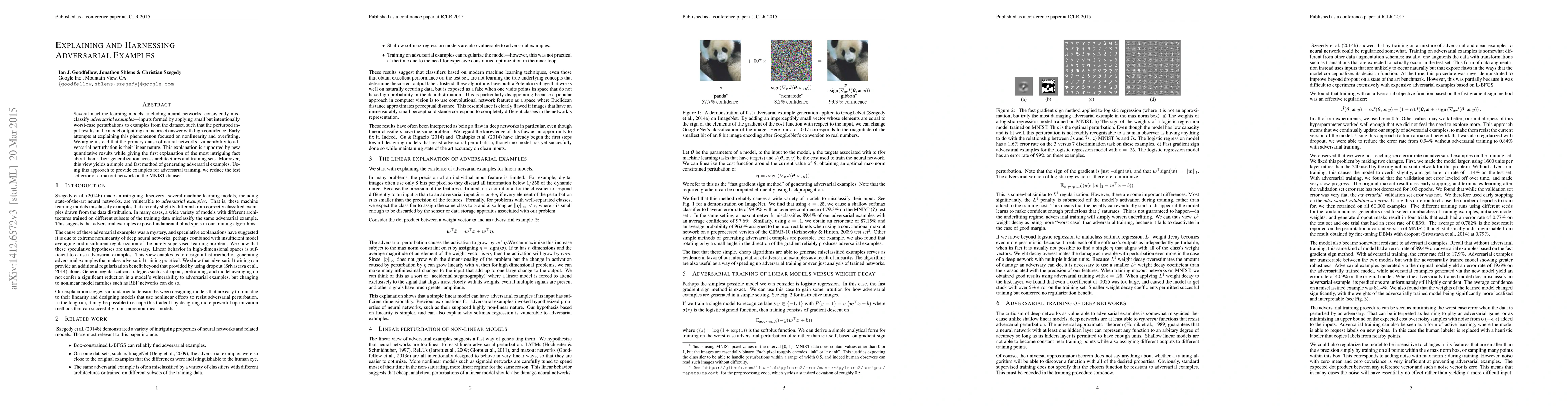 This paper argues that neural networks' vulnerability to adversarial examples stems from their inherent linearity, rather than nonlinearity or overfitting. It proposes a method to generate adversarial examples based on this insight, which is used to improve the performance of a maxout network on the MNIST dataset through adversarial training.