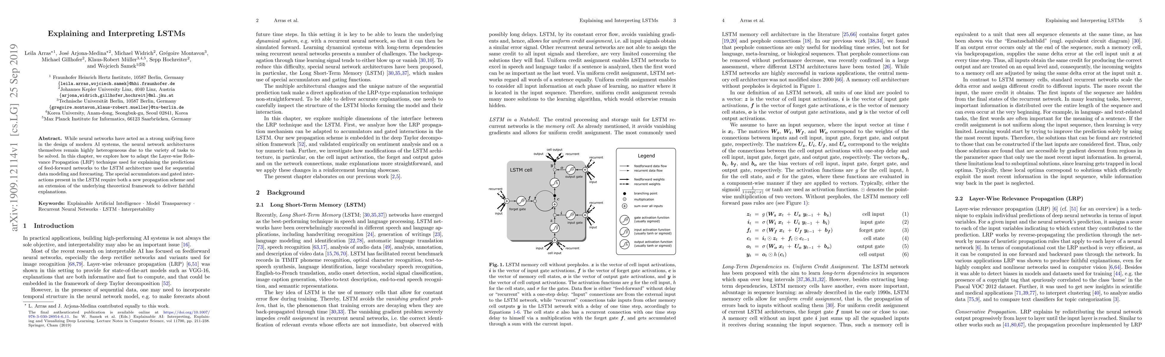 While neural networks have acted as a strong unifying force in the design of modern AI systems, the neural network architectures themselves remain highly heterogeneous due to the variety of tasks to be solved. In this chapter, we explore how to adapt the Layer-wise Relevance Propagation (LRP) technique used for explaining the predictions of feed-forward networks to the LSTM architecture used for sequential data modeling and forecasting. The special accumulators and gated interactions present in the LSTM require both a new propagation scheme and an extension of the underlying theoretical framework to deliver faithful explanations.