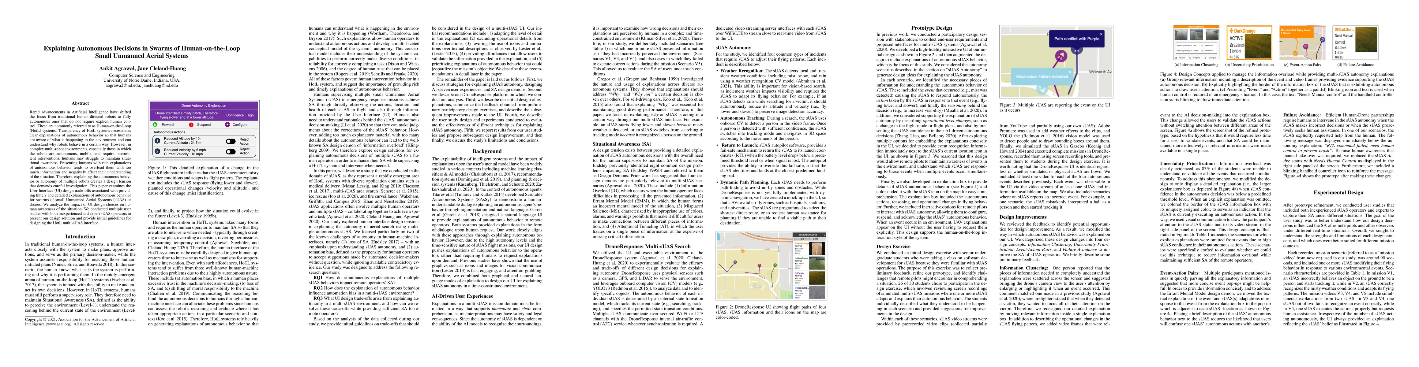 Rapid advancements in Artificial Intelligence have shifted the focus from traditional human-directed robots to fully autonomous ones that do not require explicit human control. These are commonly referred to as Human-on-the-Loop (HotL) systems. Transparency of HotL systems necessitates clear explanations of autonomous behavior so that humans are aware of what is happening in the environment and can understand why robots behave in a certain way. However, in complex multi-robot environments, especially those in which the robots are autonomous, mobile, and require intermittent interventions, humans may struggle to maintain situational awareness. Presenting humans with rich explanations of autonomous behavior tends to overload them with too much information and negatively affect their understanding of the situation. Therefore, explaining the autonomous behavior or autonomy of multiple robots creates a design tension that demands careful investigation. This paper examines the User Interface (UI) design trade-offs associated with providing timely and detailed explanations of autonomous behavior for swarms of small Unmanned Aerial Systems (sUAS) or drones. We analyze the impact of UI design choices on human awareness of the situation. We conducted multiple user studies with both inexperienced and expert sUAS operators to present our design solution and provide initial guidelines for designing the HotL multi-sUAS interface.