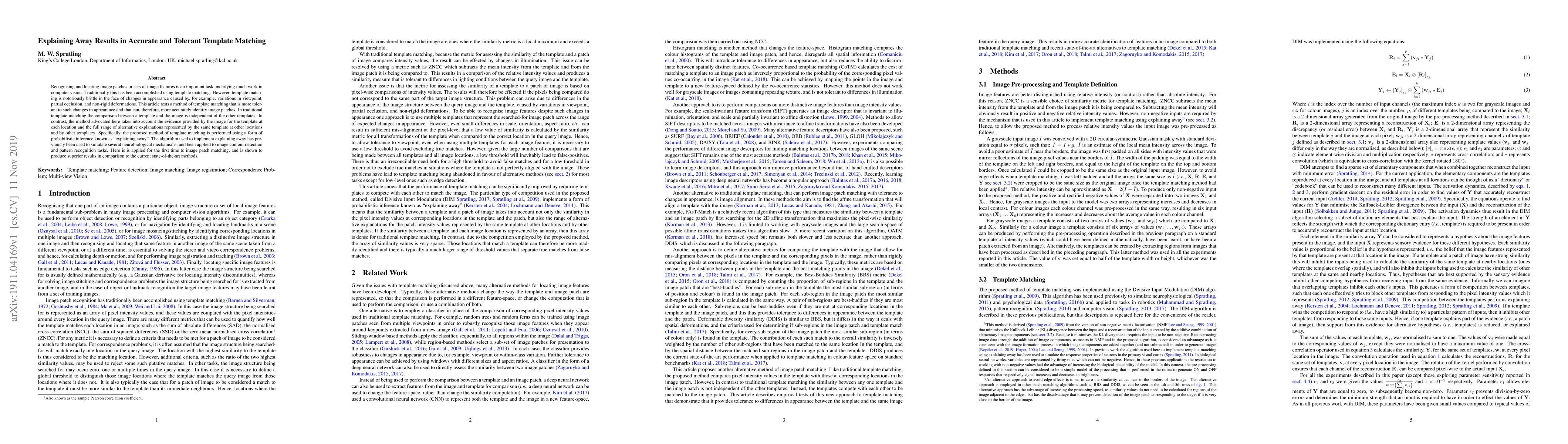 This paper proposes a novel template matching method using "explaining away" probabilistic inference to improve accuracy and tolerance to appearance changes in image patches, outperforming current state-of-the-art techniques by considering contextual evidence from multiple templates and locations.