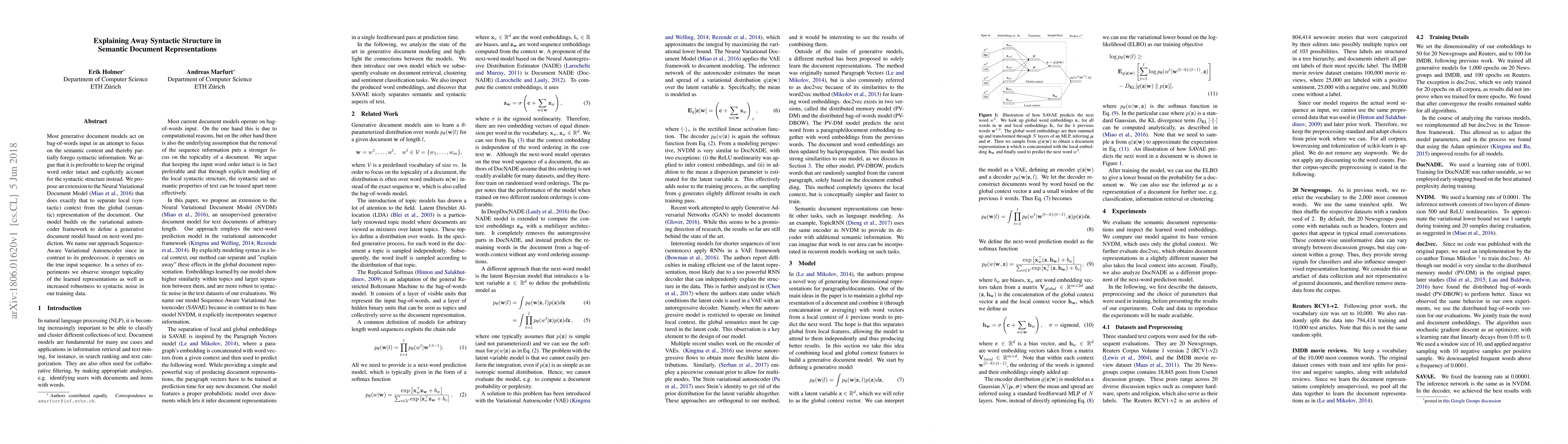 Most generative document models act on bag-of-words input in an attempt to focus on the semantic content and thereby partially forego syntactic information. We argue that it is preferable to keep the original word order intact and explicitly account for the syntactic structure instead. We propose an extension to the Neural Variational Document Model (Miao et al., 2016) that does exactly that to separate local (syntactic) context from the global (semantic) representation of the document. Our model builds on the variational autoencoder framework to define a generative document model based on next-word prediction. We name our approach Sequence-Aware Variational Autoencoder since in contrast to its predecessor, it operates on the true input sequence. In a series of experiments we observe stronger topicality of the learned representations as well as increased robustness to syntactic noise in our training data.