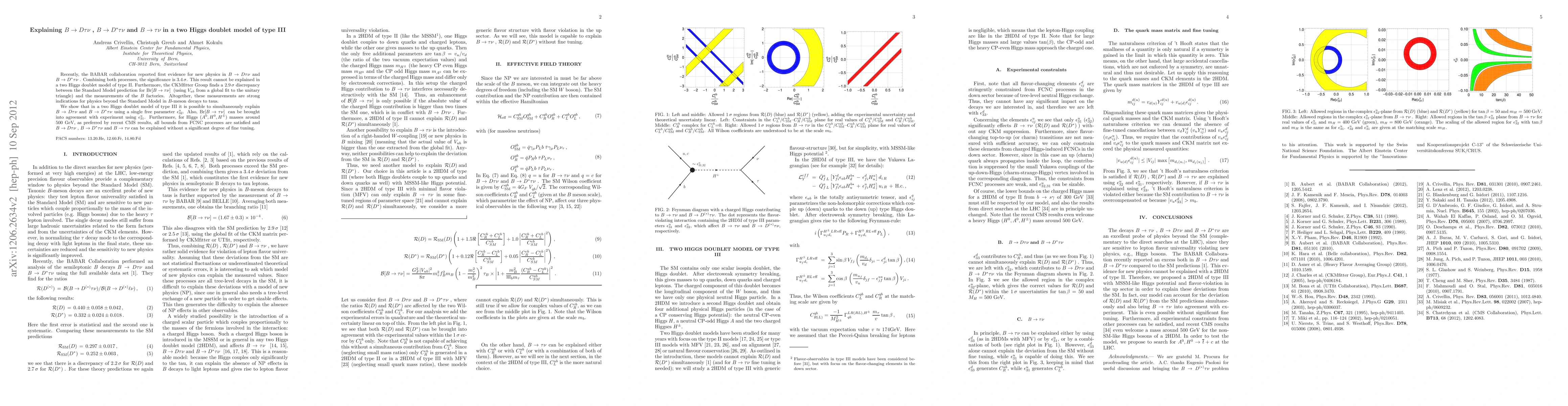 Recently, the BaBar collaboration reported first evidence for new physics in B->D\tau\nu and B->D*\tau\nu. Combining both processes the significance is 3.4\sigma. This result cannot be explained in a two Higgs doublet model of type II. Furthermore, the CKMfitter group finds a 2.9\sigma discrepancy between the Standard Model prediction for Br[B->\tau\nu] (using Vub from a global fit to the unitary triangle) and the measurements of the B factories. Altogether, these measurements are strong indications for physics beyond the SM in B meson decays to taus. We show that in a two Higgs doublet model of type III it is possible to simultaneously explain \bdtau and \bdstau using a single free parameter \epsilon^u_32. Also Br[B->\tau\nu] can be brought into agreement with experiment using \epsilon^u_31. Furthermore, for Higgs (A^0, H^0, H^+) masses around 500 GeV, as suggested by recent CMS results, all bounds from FCNC processes are satisfied and B->D\tau\nu, B->D*\tau\nu and B->\tau\nu can be explained without a significant degree of fine-tuning.